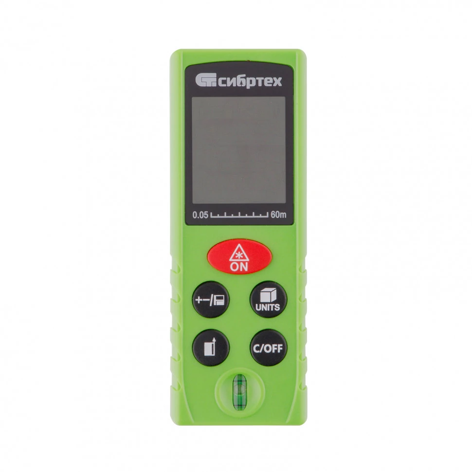 Лазерный дальномер Сибртех РМ-60 может определять длину, объем и площадь помещения. Он применяется при проведении строительных и отделочных работ: укладке плитки, установке окон, дверей, напольных покрытий, натяжных потолков. Высокая дальность измерения до 60 м позволяет работать на улице, поэтому дальномер пригодится геодезистам и дорожным службам.Преимущества:За счет встроенной опции Пифагора дальномер может вычислять расстояние даже при наличии препятствий на пути луча.Результаты последних 20 замеров сохраняются в памяти дальномера для удобства работы.Если нужно работать в движении, то поможет опция непрерывных измерений. Прибор делает замеры каждую секунду, пока нужное расстояние не будет найдено.Функция складывания и вычитания позволяет производить расчеты без калькулятора.Высокую точность измерения обеспечивает пузырьковый уровень, с помощью которого дальномер можно выровнять на поверхности.Корпус выполнен из ABS-пластика, это повышает его прочность.Автоматическое отключение экономит заряд батарей - есл