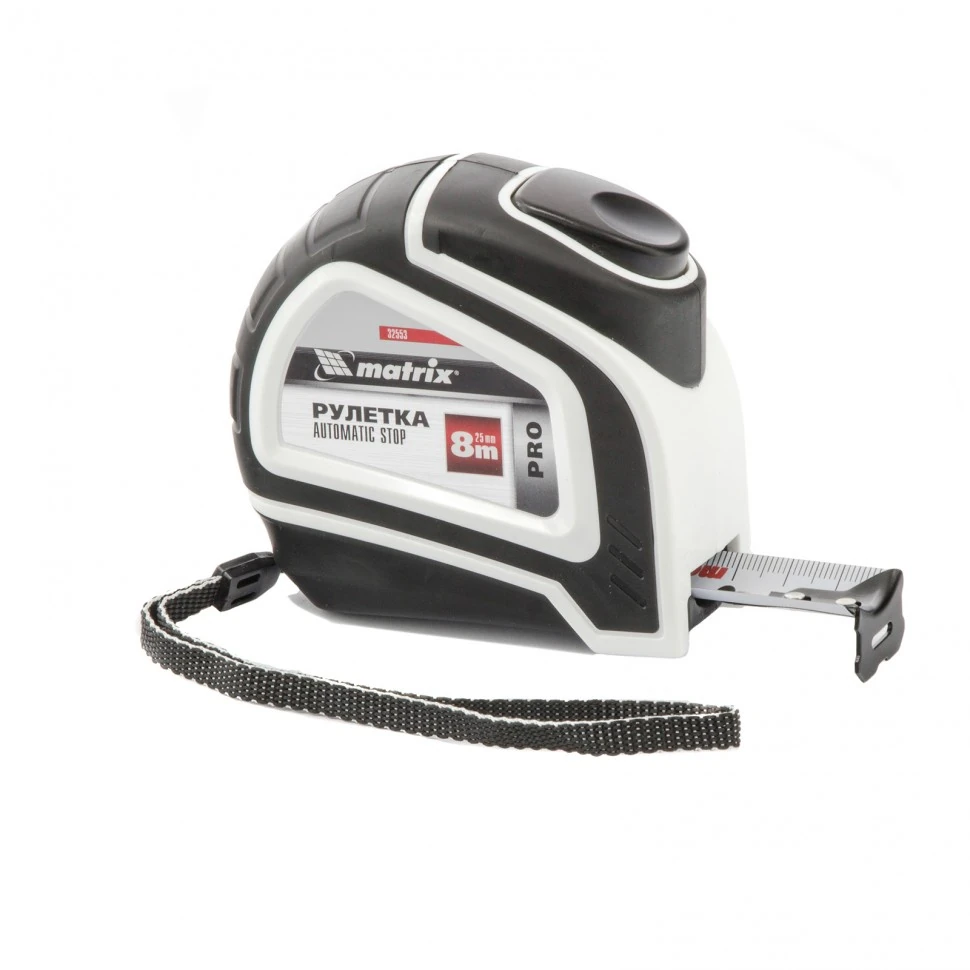 Рулетка Matrix PRO Autostop 32553, 8 м х 25 мм, в двухкомпонентном корпусе, с автоматической фиксацией полотна, используется для измерения объектов и расстояний. Корпус изготовлен из ударопрочного ABS-пластика, а резиновые элементы увеличивают его сопротивляемость механическим нагрузкам. Заклепки надежно фиксируют зацеп на конце измерительного полотна. Рулетка подходит для профессионального и бытового применения.ПреимуществаБлагодаря подвижному зацепу «true zero», нивелирующему толщину крючка, результаты измерений характеризуются высокой точностью.Лента автоматически фиксируется в вытянутом положении, что упрощает и ускоряет измерение.Полотно шириной 25 мм обладает значительной величиной вылета, что облегчает произведение замеров в труднодоступных местах.Нейлоновый ремешок позволяет освободить руки, повесив рулетку на запястье.На корпусе имеется зажим, при помощи которого рулетку можно закрепить на поясном ремне.