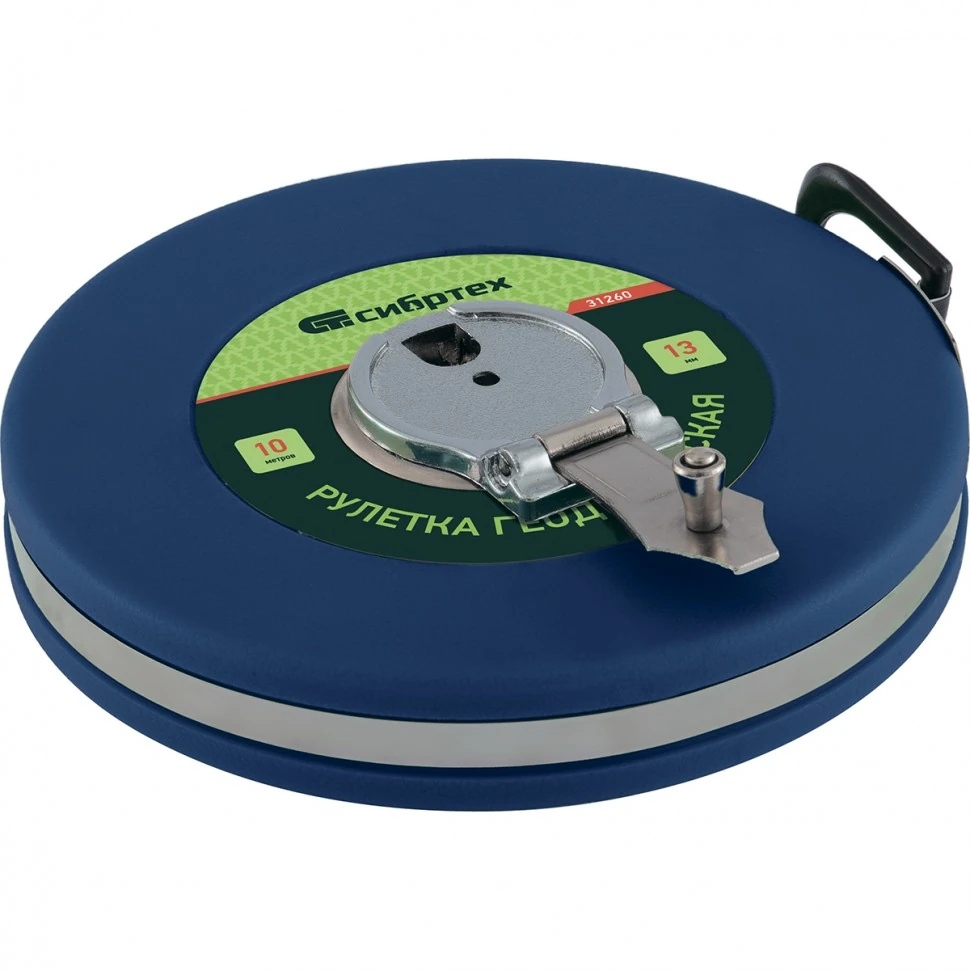 Геодезическая рулетка Сибртех 31263, 50 м х 13 мм, в закрытом корпусе, с фибергласовой лентой, — измерительный инструмент для определения расстояний и проведения замеров различных объектов. Закрытый корпус из прочного ABS-пластика, усиленный стальной лентой, обеспечивает инструменту повышенную стойкость к механическим воздействиям. Рулетка пригодится при выполнении строительных и ремонтных работ, обмеров садовых участков, а также при формировании ландшафтов.ПреимуществаФибергласовое измерительное полотно не подвержено коррозии и устойчиво к повреждениям, что продлевает срок службы инструмента.Складной стальной зацеп фиксирует конец ленты на объекте, что облегчает проведение измерений.Возвратный механизм открывается нажатием кнопки, поэтому инструмент удобен в эксплуатации.