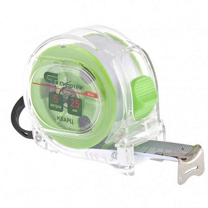 Рулетка Сибртех Кварц 32522 с полотном размером 5 м х 25 мм, в прозрачном корпусе, с амортизатором, будет полезна для измерения длины конструкций, строительных материалов и т.д. Пригодится на строительной площадке, в гараже, мастерской и в быту.ПреимуществаДолговечность и надежность — корпус из поликарбоната с амортизатором защищен от внешних воздействий и не разрушается при быстром возврате ленты.Подвижной зацеп True-zero — толщина зацепа компенсируется для повышения точности измерений.Удобная упаковка — рулетка поставляется в картонной подвесной карте.Безопасная эксплуатация — рулетку можно подвесить за ремешок на запястье для предотвращения ее падения во время работы.