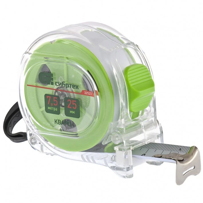 Рулетка Сибртех Кварц 32523 с полотном размером 7,5 м х 25 мм, в прозрачном корпусе, с амортизатором, будет полезна для измерения длины конструкций, строительных материалов и т.д. Пригодится на строительной площадке, в гараже, мастерской и в быту.ПреимуществаДолговечность и надежность — корпус из поликарбоната с амортизатором защищен от внешних воздействий и не разрушается при быстром возврате ленты.Подвижной зацеп True-zero — толщина зацепа компенсируется для повышения точности измерений.Удобная упаковка — рулетка поставляется в картонной подвесной карте.Безопасная эксплуатация — рулетку можно подвесить за ремешок на запястье для предотвращения ее падения во время работы.