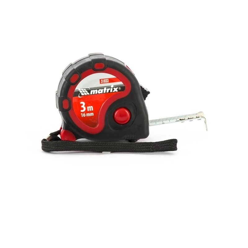 Рулетка Matrix Status 3 fixations 31033, 3 м х 16 мм, в двухкомпонентном корпусе, с 3 способами фиксации ленты, предназначена для проведения измерений, имеет 2 класс точности и цену деления 1 мм. Механизм рулетки помещен в частично обрезиненный корпус из прочного пластика, что защищает инструмент от повреждений в случае падений или ударов. Зацеп надежно прикреплен к измерительной ленте заклепками. Рулетка пригодится строителям, ремонтникам, будет полезна и в быту.ПреимуществаКорпус имеет эргономичную форму, поэтому удобно лежит в руке и не выскальзывает из ладони.На стальную ленту нанесено полимерное покрытие, повышающее ее стойкость к истиранию.3 независимых механизма фиксации полотна упрощают проведение замеров.Инструмент имеет подвижный зацеп «true zero», обеспечивающий высокую точность измерений.Нейлоновый ремешок позволяет подвешивать рулетку на запястье, что удобно, если нужно освободить руки.На корпусе имеется металлический зажим, при помощи которого можно закрепить рулетку на поясе.