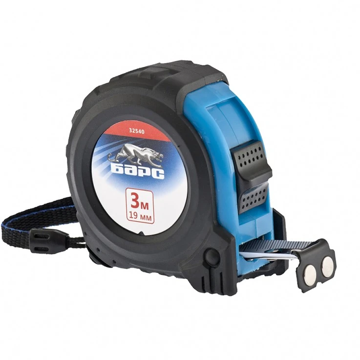 Рулетка Барс Вектор 32540 с утолщенным полотном 3 м х 19 мм и магнитным зацепом, в обрезиненном корпусе, используется при проведении линейных измерений. Незаменима в хозяйстве и на строительной площадке для вычисления размеров заготовок, конструкций и т.д.ПреимуществаКорпус выполнен из ABS-пластика и имеет резиновый чехол, что обеспечивает защиту от ударного воздействия.Долговечность механизма рулетки гарантирует рабочая пружина из стали 60 Mn.Высокий ресурс полотна достигается за счет его утолщения и ширины 19 мм.Магнитный зацеп на полотне обеспечивает возможность фиксации с металлическими поверхностями.Полотно покрыто белой краской и имеет крупную шкалу, благодаря чему результаты измерений легко считываются.Рулетка оснащена нейлоновым ремешком и клипсой для удобства работы и транспортировки.