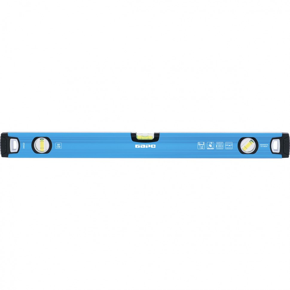 Фрезерованный алюминиевый уровень Барс 34430 длиной 1500 мм, с профилем 1,6 мм и ударопрочными заглушками, оснащен 3 глазками, которые позволяют проверить вертикальные, горизонтальные поверхности и соответствие наклонных поверхностей углу 45 градусов. Инструмент повышает точность строительных и ремонтных работ.Для определения отклонения вертикали 90 градусов необходимо использовать пузырьковую ампулу только в верхнем положении уровня. Только базовая поверхность является рабочей (противоположная ампуле 180 градусов).ПреимуществаИнструмент изготовлен из легкого и прочного алюминиевого профиля (марка 6063).Высокая точность работы достигается за счет фрезерованной рабочей части и двойного контроля при установке ампул.V-образная форма подошвы обеспечивает возможность фиксации инструмента на трубах при проведении сантехнических работ.Уровень выдерживает падения с небольшой высоты за счет заглушек из износостойкой термопластичной резины (TPR).Строительный уровень удобно хранить на крючке, т.к. в боковых частях имеют