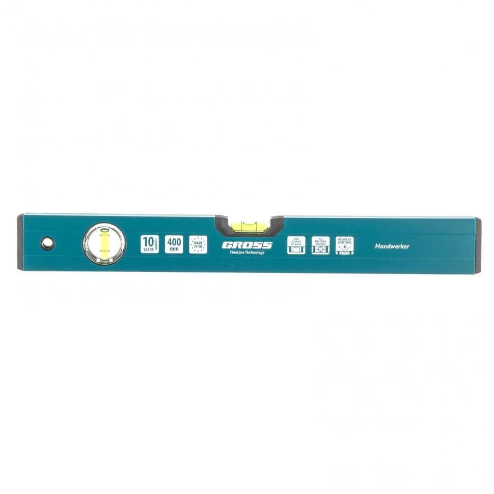 Алюминиевый уровень Gross Handwerker 33900 длиной 400 мм снабжен 2 глазками для проверки отклонений от вертикали или горизонтали. Станет незаменимым инструментом на строительной площадке и в быту, когда необходима высокая точность работы.Для определения отклонения вертикали 90 градусов необходимо использовать пузырьковую ампулу только в верхнем положении уровня. Только базовая поверхность является рабочей (противоположная ампуле 180 градусов).ПреимуществаАлюминиевый профиль обладает высокой прочностью и жесткостью, что повышает ресурс уровня.Контроль монтажа ампул осуществлен электронным методом, это обеспечивает снижение погрешности до 0,5 мм/м.Строительный уровень произведен в Европе, что является залогом его высокого качества.