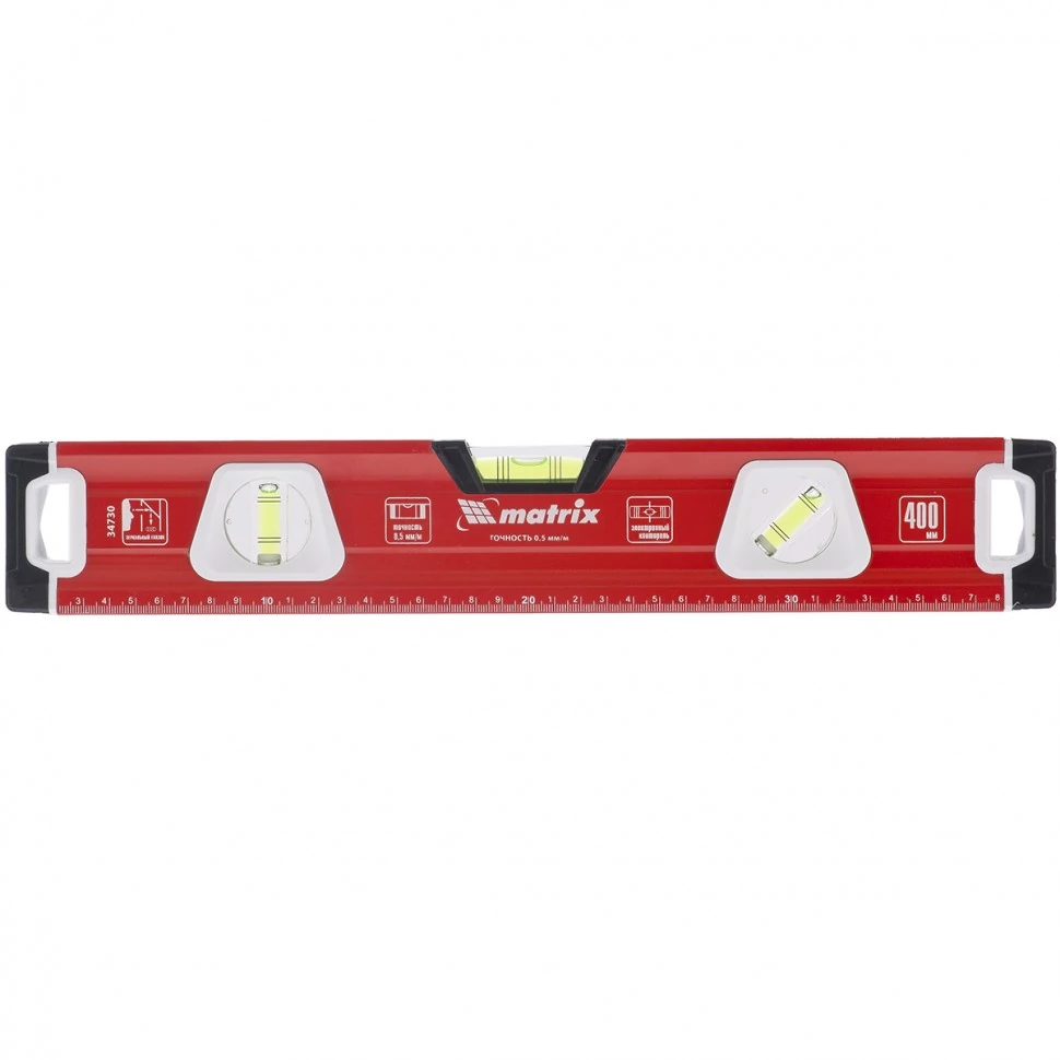 Фрезерованный алюминиевый уровень Matrix 34730 длиной 400 мм используется при монтаже конструкций и материалов. Благодаря ему можно обнаружить отклонения от вертикали, горизонтали и угла 45 градусов, поэтому он повысит точность строительных и ремонтных работ.Для определения отклонения вертикали 90 градусов необходимо использовать пузырьковую ампулу только в верхнем положении уровня. Только базовая поверхность является рабочей (противоположная ампуле 180 градусов).ПреимуществаИнструмент выполнен из прочного алюминиевого профиля, не подверженного образованию коррозии.Установленные под электронным контролем пузырьковые ампулы позволяют повысить точность проводимых измерений.Погрешность измерений сведена к минимуму (0,5 мм/м), т.к. базовая грань инструмента отфрезерована.Магнитная полоса внутри корпуса обеспечивает удобное и надежное крепление уровня на металлических поверхностях.Инструмент может использоваться как линейка благодаря наличию измерительной шкалы.Торцевые заглушки предотвращают попадание пыли в корп
