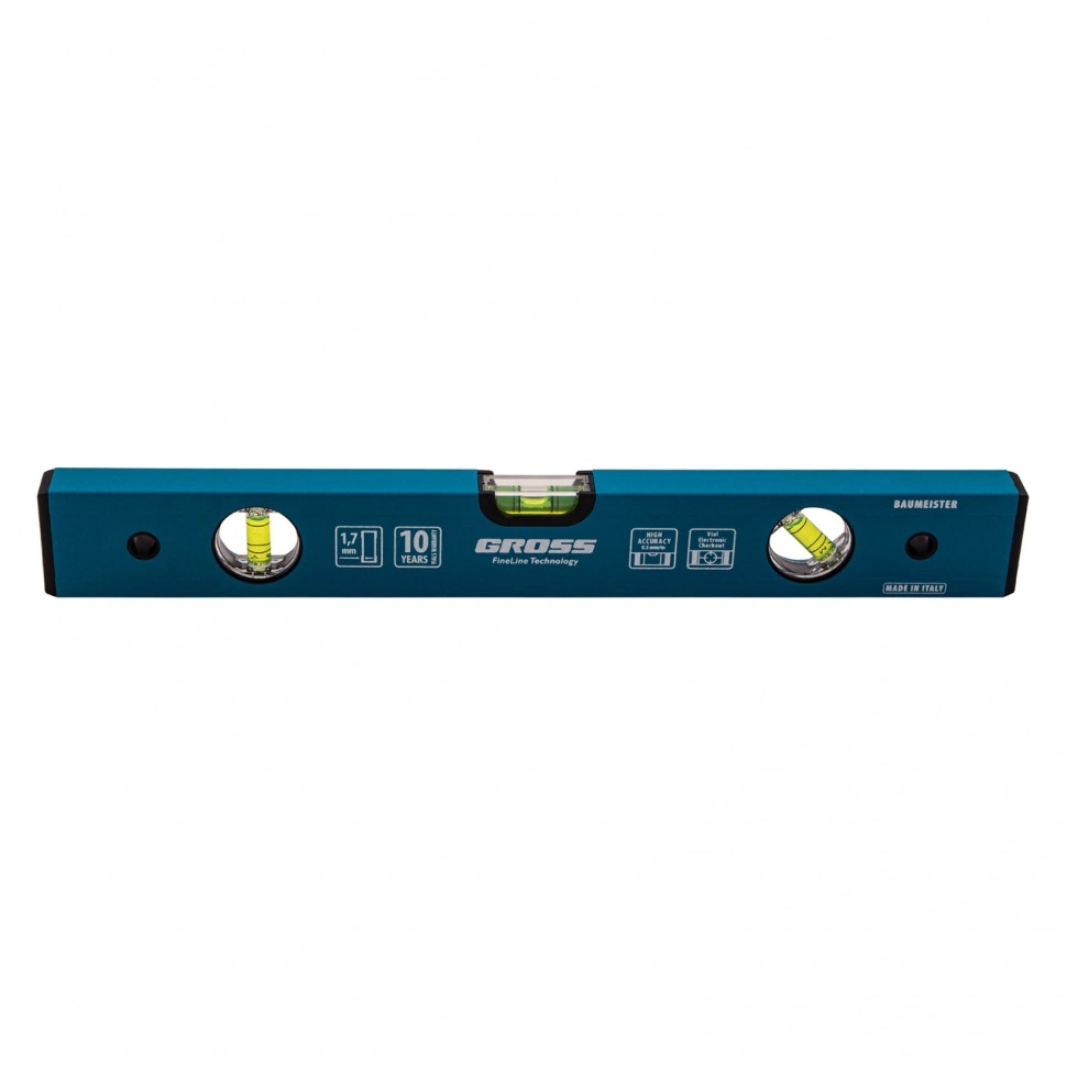 Усиленный алюминиевый уровень Gross 33624 длиной 400 мм, с 3 глазками, поможет найти отклонения от горизонтали и вертикали для повышения точности работы. Этот простой, но незаменимый для любого мастера инструмент пригодится на стройке, при проведении ремонтных и монтажных работ. Уровень с глазком на 45 градусов позволяет измерить угол наклона, поэтому также пригодится при кровельных работах, проверке откосов и различных наклонных поверхностей.ПреимуществаПротивоударная конструкция — колбы из полистирола обладают высокой стойкостью к механическим воздействиям, поэтому инструмент выдерживает падения с небольшой высоты.Защитное порошковое покрытие — инструмент устойчив к воздействию агрессивных сред.Качественное исполнение — уровень изготовлен в Италии на высокотехнологичном производстве, погрешность измерений составляет всего 0,5 мм/м.Для определения отклонения вертикали 90 градусов необходимо использовать пузырьковую ампулу только в верхнем положении уровня. Только базовая поверхность является рабочей (противо