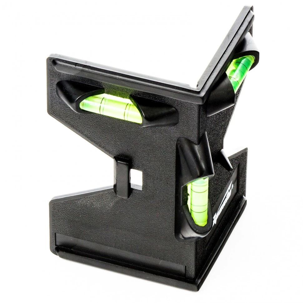Многофункциональный уровень изготовлен из ударопрочной пластмассы, Имеет угловую форму, позволяющую производить измерения под разными углами на различных поверхностях, Имеет три цилиндрических глазка,ПримечаниеДля определения отклонения в