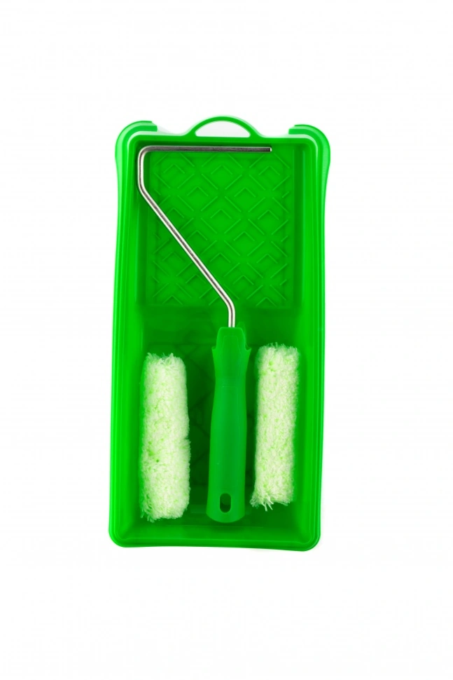 Малярный набор для работ по дереву Сибртех 80454 включает 2 сменных мини-валика шириной 110 мм, бюгель и кювету размером 150 мм х 290 мм. Он используется для нанесения антисептиков, пропиток, грунтовок, лазури, защитных составов и прочих невязких материалов. Шубки из микроволокна отличаются высоким коэффициентом впитываемости и отдачи краски, что обеспечивает ее равномерное нанесение на древесину различной фактуры.ПреимуществаУдобное окрашивание небольших поверхностей — мини-валики имеют ширину 110 мм, поэтому подходят даже для труднодоступных участков.Прочная кювета — она выполнена из высококачественной пластмассы и устойчива к механическим нагрузкам.Экономный расход лакокрасочных материалов — благодаря специальной конструкции кюветы излишки краски стекают в ванночку, а не скапливаются на раскаточной доске.Комфортная эксплуатация — эргономичная рукоятка бюгеля обеспечивает удобный захват, что снижает усталость мастера во время длительной работы.