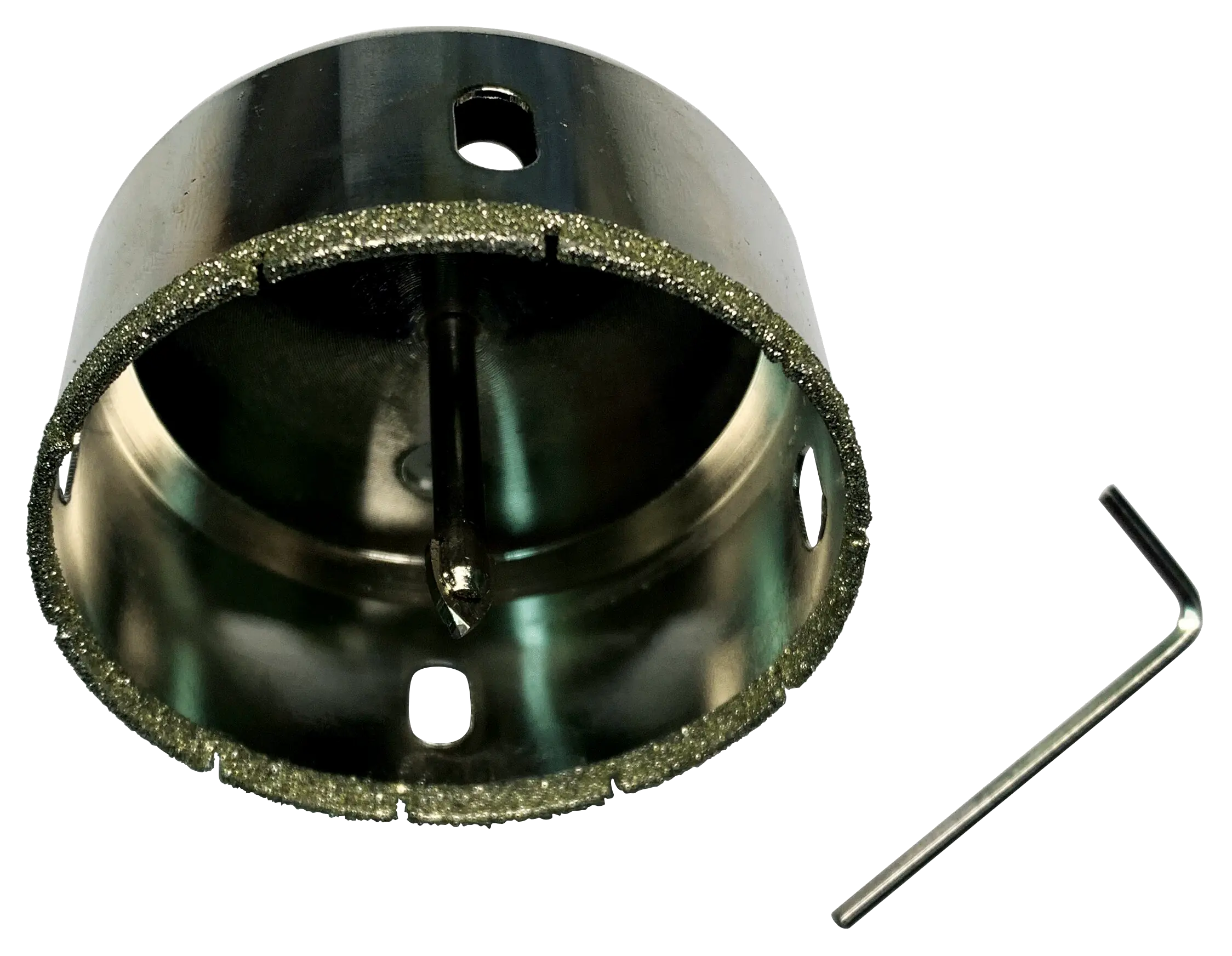 Алмазная коронка «РОСОМАХА» с центрирующим сверлом изготовлена методом вакуумной пайки. Используется для сверления керамогранита, кафеля, керамики и стекла. При эксплуатации инструмента для увеличения производительности и срока службы в зону реза должна подаваться вода.