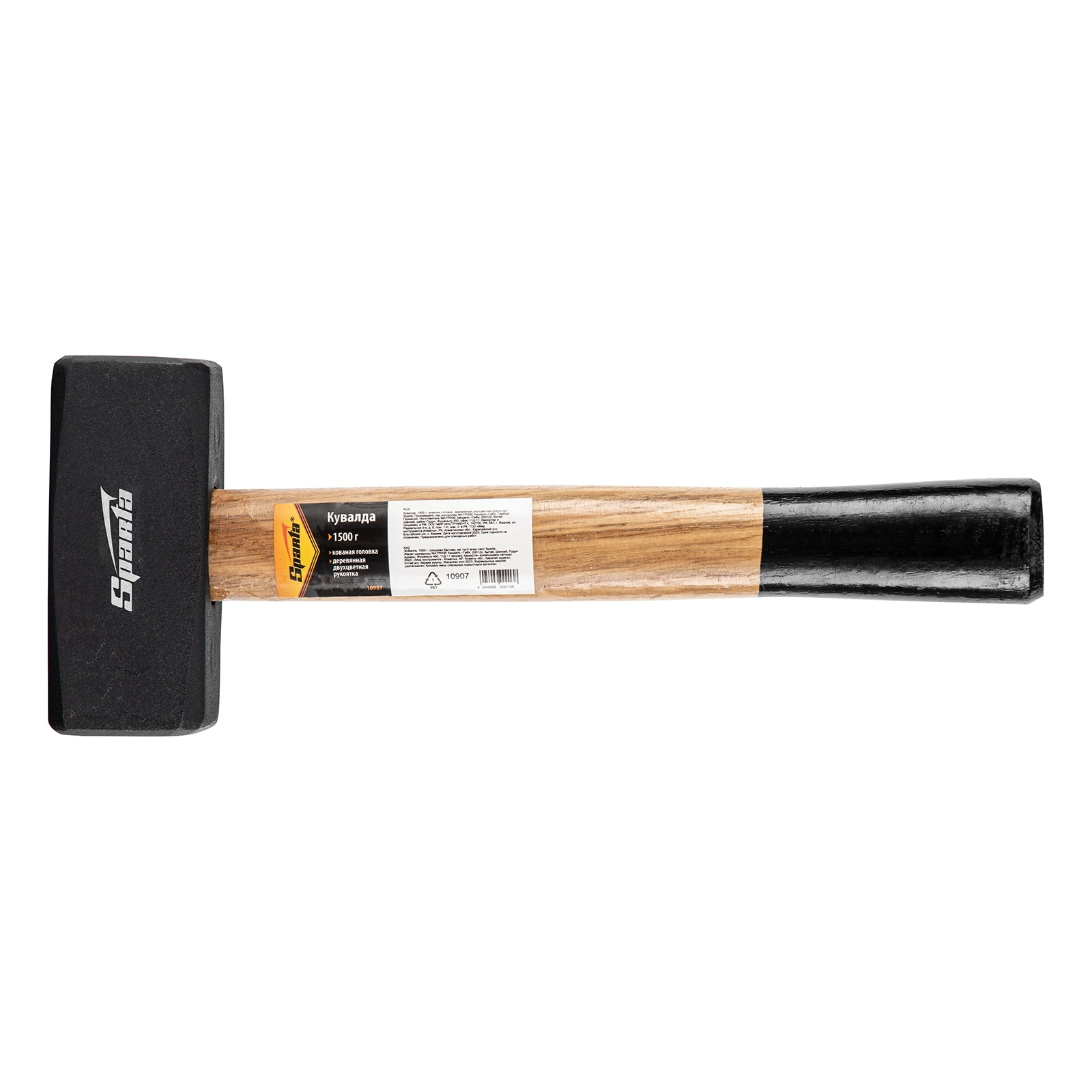 Кувалда Sparta 10907, длиной 310 мм, с бойком весом 1500 г, кованой головкой и деревянной двухцветной рукояткой, - ударный инструмент, которым можно наносить аккуратные контролируемые удары, чтобы выправить форму детали, забить большой гвоздь или скобу. Слегка выпуклый боек изготовлен методом ковки и отшлифован с двух сторон, поэтому отличается надежностью. Кувалда используется в быту при проведении строительных работ и для ремонта автомобилей.ПреимуществаМатериал бойка - среднеуглеродистая сталь 45, закаленная токами высокой частоты до твердости 40-45 HRC, которая имеет достаточную прочность, не расколется и не расплющится при ударе о металл.Ударные поверхности имеют грани со снятыми фасками, что предотвращает откалывание мелких частиц во время работы.Голова кувалды покрыта черным лаком, что защищает ее от ржавчины и продлевает срок службы инструмента.Рукоятка расклинена в голове и залита смолой, поэтому боек не слетит при ударе.Деревянная рукоять не скользит в руке, а лакировка защищает ее от рассыхания.