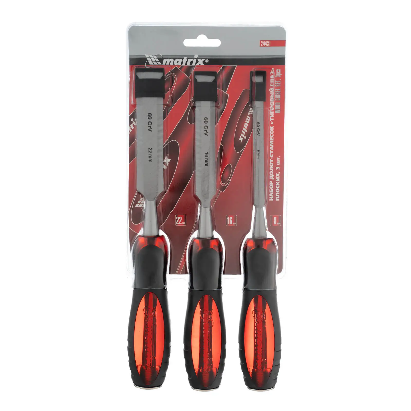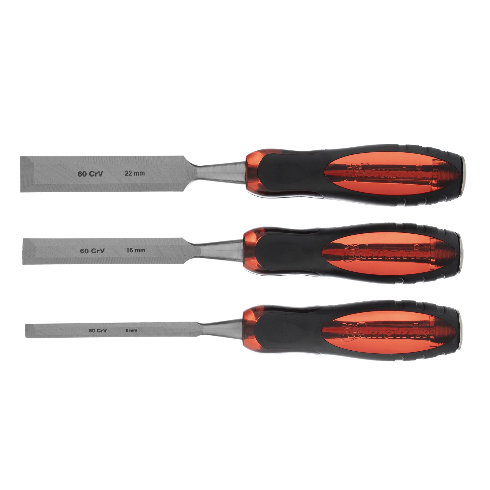 Набор плоских долот-стамесок Matrix «Тигровый глаз» 24431, 3 штуки, 8-16-22 мм, используется при обработке древесины любых пород. Стамески позволяют выбирать пазы, проделывать выемки, снимать фаски, выдалбливать отверстия разной ширины. Ударопрочный пластик рукояток и металлический затыльник позволяют применять киянку или молоток для легкого врезания в древесину любой твердости. Набор пригодится столярам, плотникам и мебельным мастерам.ПреимуществаСтамески изготовлены из инструментальной легированной стали CrV-группы повышенной прочности и легко выдерживают ударные нагрузки.Сквозной металлический стержень повышает прочность инструмента и обеспечивает долгий срок службы.Твердость 2/3 рабочей части полотна составляет 60 HRC - инструменты долго сохраняют режущую способность, позволяют получать максимально ровные срезы.Режущие кромки заточены до остроты бритвы под углом 20-35° и не требуют повторной заточки в течение 6-12 месяцев.Двухкомпонентные рукоятки из пластика и резины имеют рифленую поверхность, поэтому у