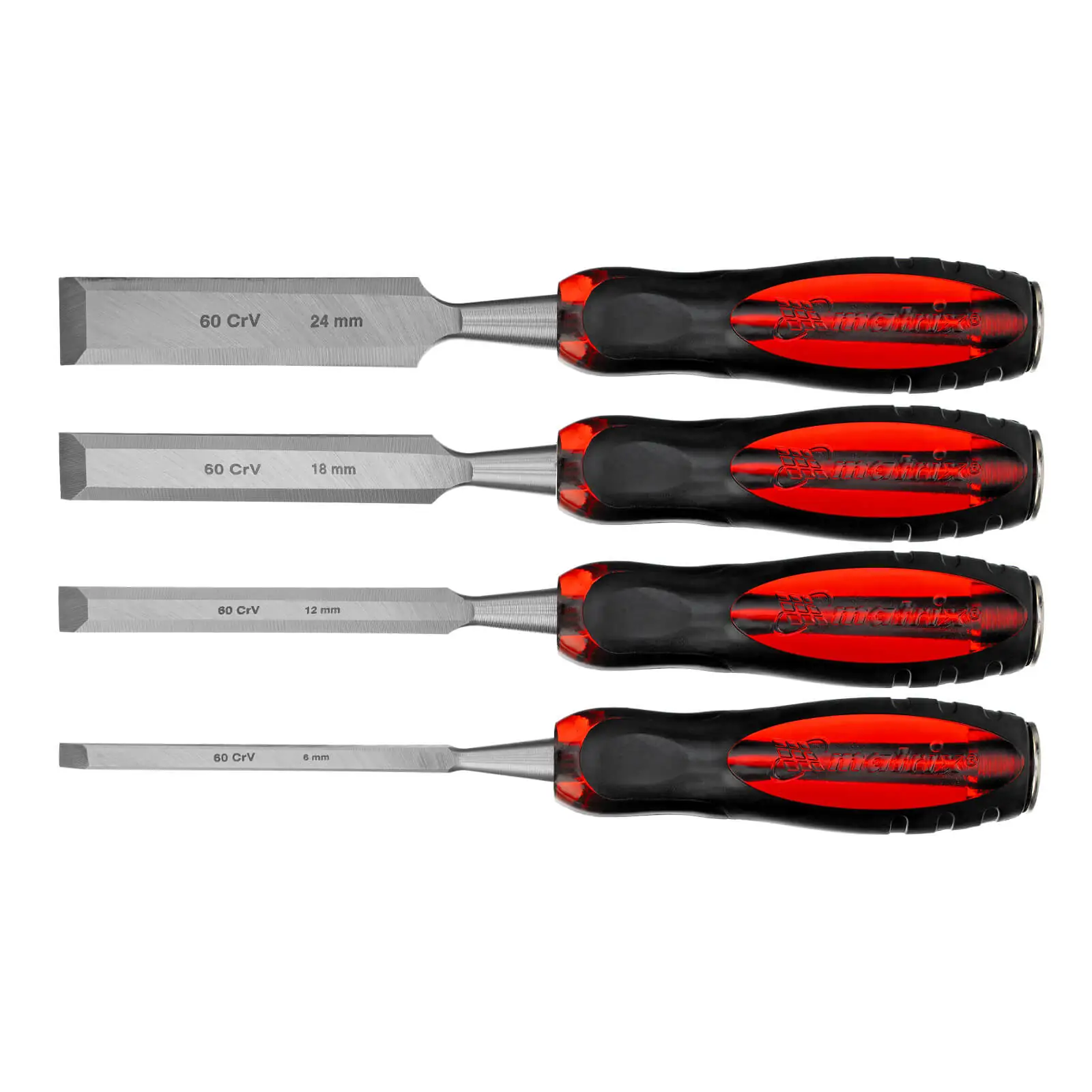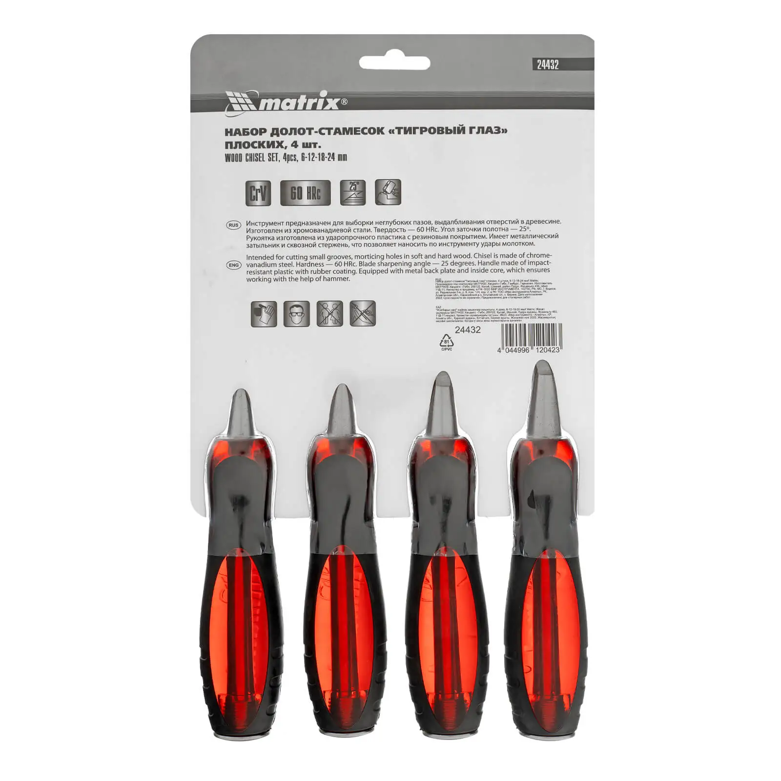 Набор плоских долот-стамесок Matrix «Тигровый глаз» 24432, 4 штуки, 6-12-18-24 мм, используется при обработке древесины любых пород. Стамески позволяют выбирать пазы, проделывать выемки, снимать фаски, выдалбливать отверстия разной ширины. Ударопрочный пластик рукояток и металлический затыльник позволяют применять киянку или молоток для легкого врезания в древесину любой твердости. Набор пригодится столярам, плотникам и мебельным мастерам.ПреимуществаСтамески изготовлены из инструментальной легированной стали CrV-группы повышенной прочности и легко выдерживают ударные нагрузки.Сквозной металлический стержень повышает прочность инструмента и обеспечивает долгий срок службы.Твердость 2/3 рабочей части полотна составляет 60 HRC - инструменты долго сохраняют режущую способность, позволяют получать максимально ровные срезы.