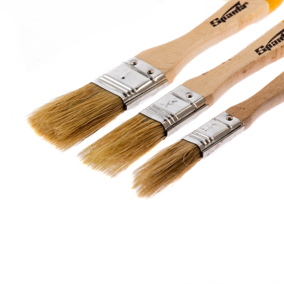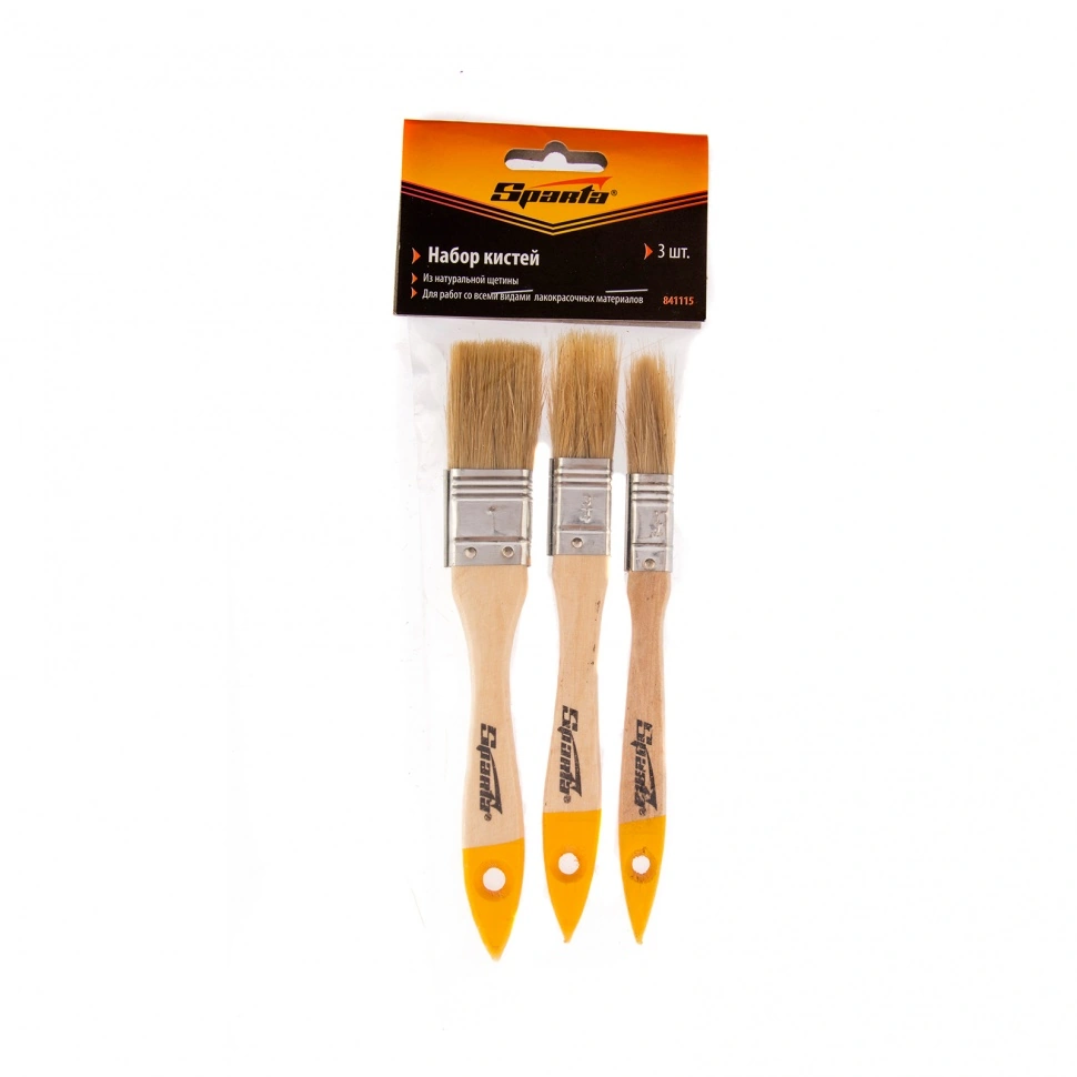 Набор плоских кистей Sparta 841115, 3 шт., пригодится при проведении покрасочных работ. Кисти с натуральной щетиной оптимальны для нанесения составов на основе растворителей, а также масляных красок. С их помощью можно получить равномерное финишное покрытие.ПреимуществаНадежность фиксации щетины обеспечивает металлический бандаж, который обработан антикоррозийным покрытием для защиты от ржавчины.Щетина расщеплена на концах, за счет чего улучшаются краскообменные свойства кистей.В состав набора входят кисти размером 1/2 дюйма, 3/4 дюйма и 1 дюйм для удобства работы на разных участках, в том числе труднодоступных.На ручках имеются специальные отверстия, благодаря которым кисти можно хранить в подвешенном состоянии.