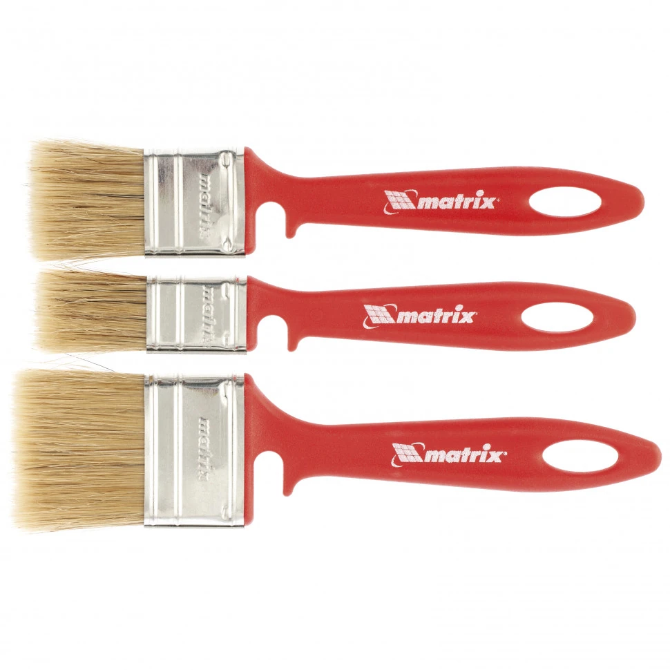 Набор Matrix Color Line «ЭМАЛИ» 83355 включает кисти шириной 25, 35 и 50 мм и предназначен для работы с эмалями, в том числе на акриловой, алкидной основе и на основе растворителя. Натуральная щетина устойчива к износу и воздействию агрессивных жидкостей, а благодаря расщепленным концам хорошо впитывает и отдает краску. Высокая плотность щетины позволяет получить качественное покрытие.ПреимуществаНатуральная светлая щетина двойной выварки обеспечивает отличный забор и удержание краски, а также равномерно распределяет ее по поверхности.Щетина надежно закреплена с помощью тщательно подобранной эпоксидной смолы, клиньев и бандажа.Пластиковые клинья не деформируются при мытье или замачивании, что обеспечивает долговечность инструментов.На бандажи нанесено специальное покрытие для защиты от ржавчины.Форма рукояток продумана таким образом, чтобы мастер не уставал даже при длительной работе.На рукоятке каждой кисти имеется вырез, позволяющий зафиксировать инструмент на малярном ведре или банке.Для удобного хранения