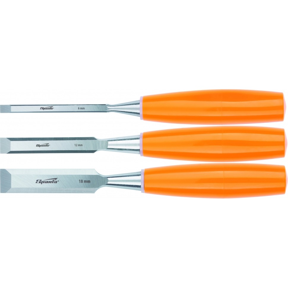 Набор плоских стамесок Sparta 24411 из 3 штук 6-12-18 мм предназначен для ручной обработки дерева - зачистки кромок и гнезд, снятия фасок, нанесения декоративной резьбы. Угол заточки составляет 20-35° - режущие кромки снимают тонкую стружку, что обеспечивает точность и аккуратность работ. Набор используется в столярном и плотницком деле, пригодится и в домашней мастерской.ПреимуществаРабочие части стамесок сделаны из качественной конструкционной углеродистой стали 55, поэтому обеспечивают твердость, прочность и, износостойкость инструмента.Твердость стамесок на длину не менее 0,7 рабочей части полотна составляет 50-55 HRC, а значит, у них высокий рабочий ресурс.Рукоятки из прочного пластика устойчивы к нагрузкам, их удобно держать в руке, что повышает комфортность эксплуатации.Яркий оранжевый дизайн рукояток позволяет быстро найти нужную стамеску на рабочем месте.