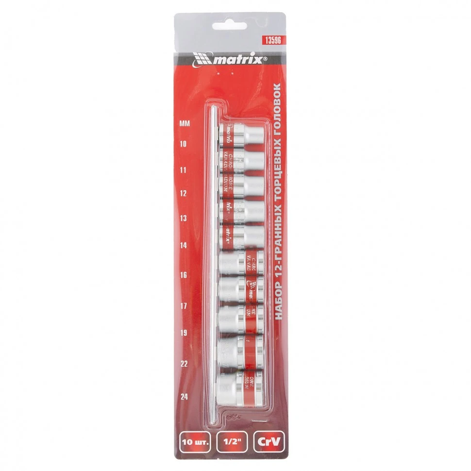 Набор торцевых головок 1/2 дюйма Matrix 13596 с 12-гранным профилем, CrV, 10 шт., 10-24 мм, предназначен для работы с резьбовыми соединениями. Насадки будут полезны автовладельцам, работникам автосервиса и домашним мастерам.ПреимуществаБлагодаря 12-гранному профилю с головками удобно работать в тесном пространстве - для поворота и перестановки инструмента требуется угол всего 30 градусов.Насадки изготовлены из хромованадиевой стали, рабочие части закалены до твердости 42 HRC, поэтому они обладают высоким рабочим ресурсом.Полированное хромоникелевое покрытие обеспечивает защиту от образования коррозии.Красные полоски на корпусах насадок облегчают их поиск.Торцевые головки удобно хранить за счет металлической планки-держателя