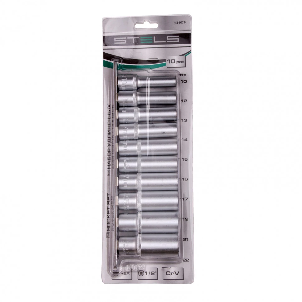 Набор удлиненных торцевых головок 1/2", шестигранные, CrV, 10 шт, 10-22 мм Stels [10 шт]