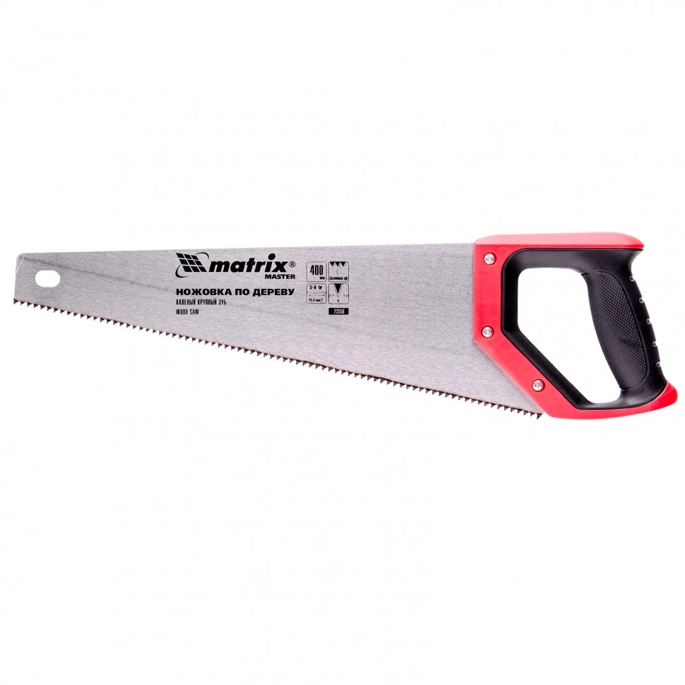 Ножовка по дереву Matrix 23556 с полотном длиной 400 мм, с крупными калеными зубьями с шагом 5-6 TPI и 2D-заточкой, с двухкомпонентной рукояткой, используется для быстрой продольной или поперечной распиловки древесины. Высокая скорость работы достигается благодаря крупным зубьям с волновой заточкой и универсальным шагом 4-5 мм. Двухгранная заточка зубьев дает возможность пилить в направлении как от себя, так и на себя, а также перетачивать режущую кромку при необходимости. Ножовка подходит для выполнения плотницких и хозяйственных работ.ПреимуществаПолотно обладает высокой механической прочностью, поскольку изготовлено из пружинной стали 65Mn.Рабочая кромка долго сохраняет режущие свойства благодаря закаленным зубьям.Инструмент устойчив к коррозии, т.к. его полотно покрыто защитным лаком.Работа с ножовкой комфортна, поскольку эргономичная рукоятка с рельефной поверхностью не скользит в руке.Высокое качество ножовки подтверждено производителем, осуществляющим постоянный технологический контроль на всех этапах