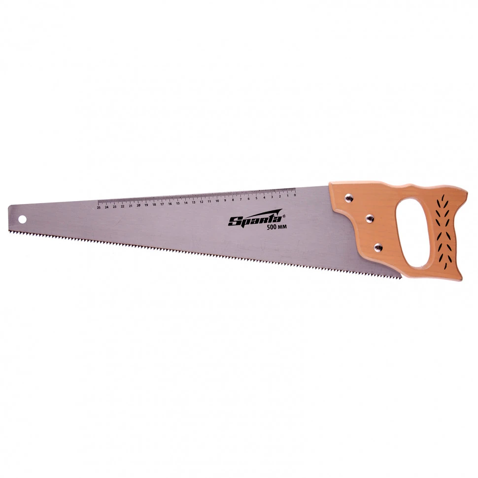Ножовка по дереву Sparta 231895 с полотном длиной 500 мм, с калеными зубьями с шагом 7-8 TPI, с линейкой и деревянной рукояткой, предназначена для продольно-поперечного распиливания древесины. Благодаря зубьям с 2D-заточкой подходит для двухстороннего реза. Режущую кромку можно перетачивать. На полотно нанесена измерительная шкала, позволяющая производить замеры, не тратя время на поиск линейки. Ножовка используется в столярном и плотницком деле, а также полезна дома и на даче.ПреимуществаПрочность — полотно изготовлено из пружинной холоднокатаной стали 65Mn, характеризующейся стойкостью к постоянным нагрузкам.Высокий ресурс — зубья закалены до твердости 55 HRC и хорошо держат заточку.Производительность — крупные зубья с шагом 7-8 TPI обеспечивают быстрый рез.Устойчивость к коррозии — на полотно нанесено защитное лаковое покрытие.Надежность — полотно крепко зафиксировано в рукоятке при помощи винтов.Комфорт во время работы — рукоятка выполнена из дерева и покрыта лаком для защиты от рассыхания и разбухания.
