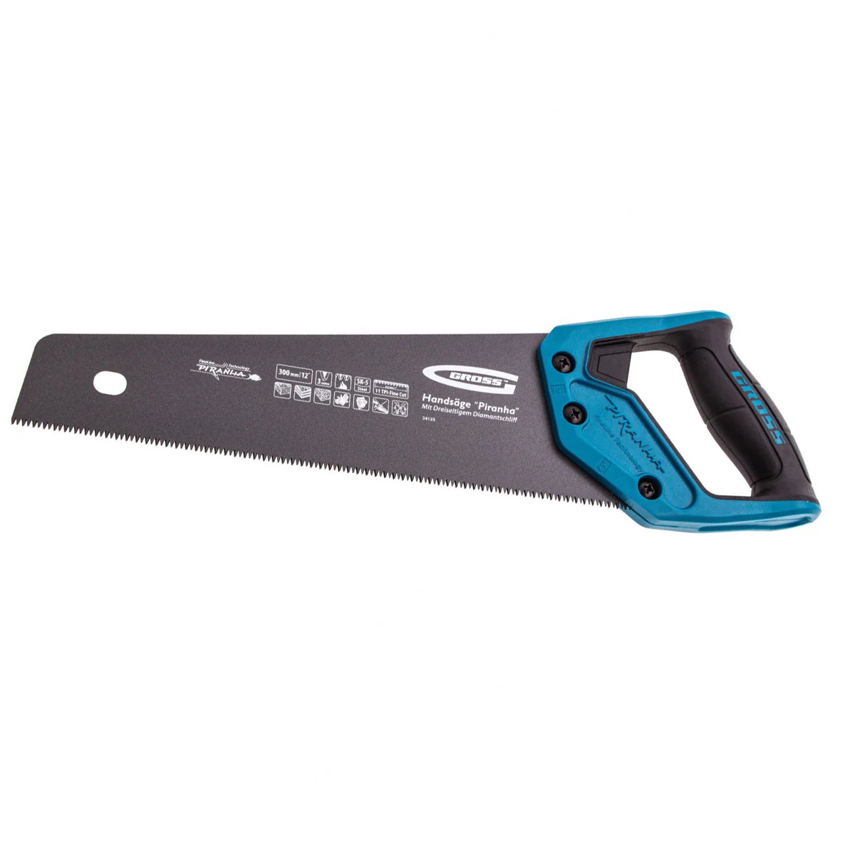 Ножовка по дереву Gross PIRANHA 24125 с полотном длиной 300 мм, калеными зубьями с 3D-заточкой и шагом 11 TPI, с тефлоновым покрытием полотна и 2-компонентной рукояткой, используется для продольного и поперечного распиливания древесины различных пород, МДФ, ДСП, ДВП, ламината, а также пенополистирола, полиуретана и других синтетических материалов. Рабочая часть состоит из мелких зубьев с шагом 2-2,3 мм, что позволяет получить ровный и чистый рез. Трехгранная заточка зубьев увеличивает производительность инструмента без потери качества распиловки. Ножовка предназначена для столярных работ.ПреимуществаПолотно изготовлено из японской пружинной стали SK-5, поэтому характеризуется высокой прочностью и устойчивостью к нагрузкам.Зубья прошли закалку токами высокой частоты и устойчивы к износу, поэтому рабочая кромка долго сохраняет режущие свойства.Поскольку основание зубьев не закалено на максимум, снижается вероятность их слома при пилении твердых материалов или попадании на металлический предмет.На поверхность по