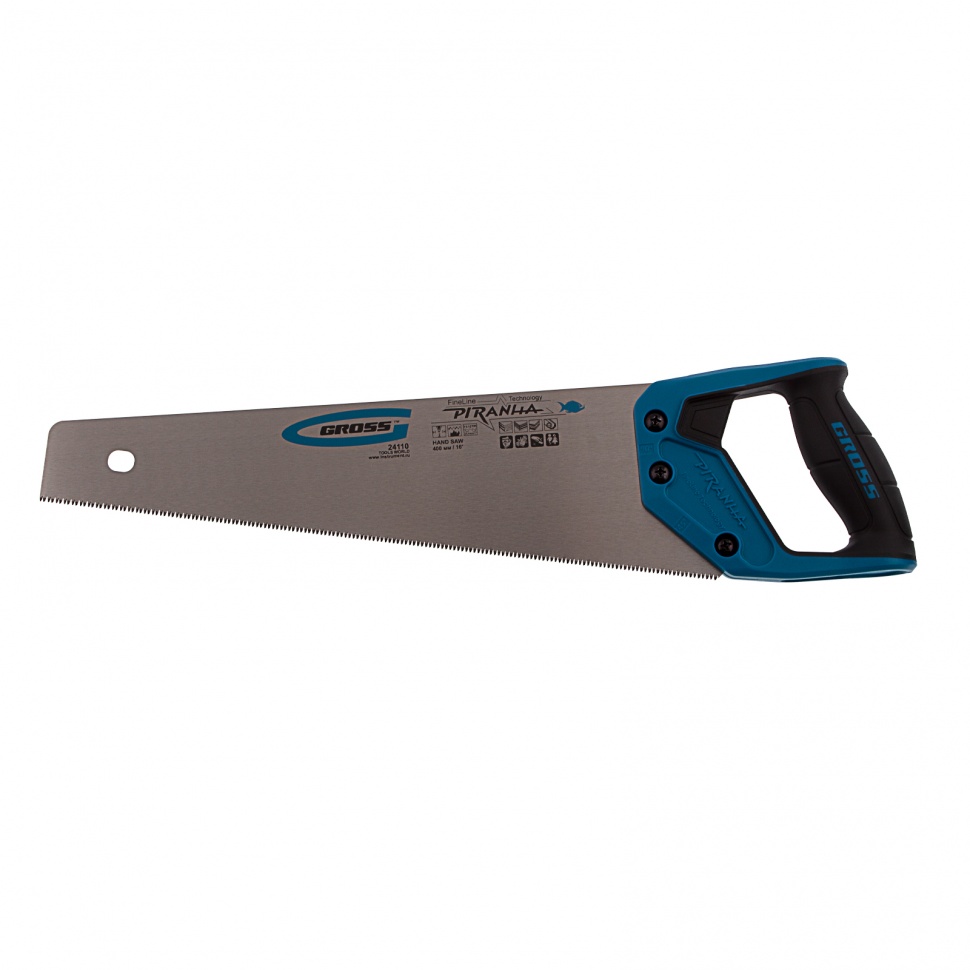 Ножовка по дереву Gross PIRANHA 24110 с полотном длиной 400 мм, калеными зубьями с 3D-заточкой и шагом 11-12 TPI, 2-компонентной рукояткой, предназначена для распиловки заготовок из древесины, ДСП, ДВП, МДФ и ламината, а также из пластических материалов, таких как пенополистирол и полиуретан. Может производить продольный и поперечный распил. Мелкие зубья с шагом 11-12 TPI позволяют выполнять точный и чистый рез. Ножовка обладает высокой производительностью благодаря трехгранной заточке зубьев. Инструмент используется в столярном деле.ПреимуществаНадежность — полотно изготовлено из высококачественной японской стали SK-5, а рукоятка — из ударопрочного ABS-пластика.Эффективная работа — зубья, закаленные токами высокой частоты, долго держат заточку.Прочность — закалка зубьев на 2/3 высоты уменьшает вероятность их слома при обработке древесины твердых пород.Коррозионная стойкость — на полотно нанесено защитное полимерное покрытие.Комфорт во время работы — благодаря эргономичной форме и рифленой поверхности рукоятк