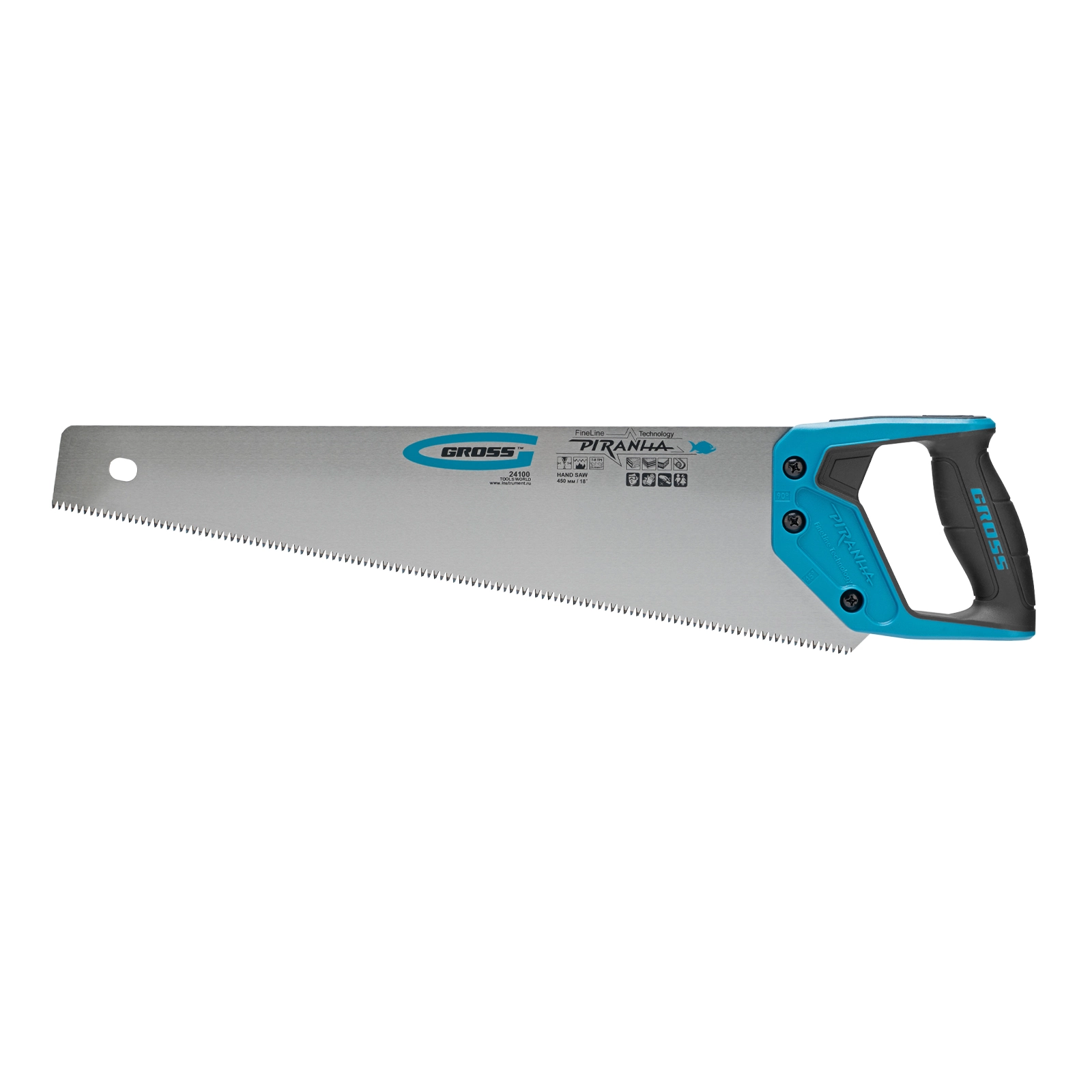 Ножовка по дереву Gross PIRANHA 24100 с полотном длиной 450 мм, калеными зубьями с 3D-заточкой и шагом 7-8 TPI, 2-компонентной рукояткой, используется для распиливания древесины, МДФ, ДСП, ДВП, ламината, а также пенополистирола, полиуретана и других пластических материалов. Подходит для продольного и поперечного пиления. Зубья имеют универсальный шаг 7-8 TPI, поэтому ножовка подходит для решения широкого спектра задач. Трехгранная заточка зубьев обеспечивает максимальную производительность и высокое качество пиления. Ножовка предназначена для столярных и плотницких работ, пригодится во время ремонта и будет полезна в быту.ПреимуществаПолотно изготовлено из японской стали SK-5, обладающей высокими прочностными характеристиками.Зубья закалены токами высокой частоты, что обеспечивает повышенную износостойкость рабочей части.Закалка зубьев на 2/3 высоты уменьшает вероятность их слома при обработке древесины твердых пород.На полотно нанесено полимерное покрытие для защиты от коррозии.Рукоятка выполнена из ударопро