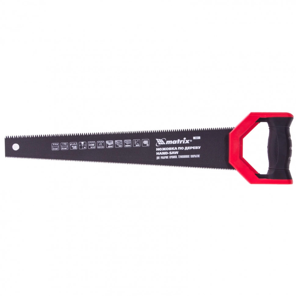Ножовка по дереву Matrix UNIVERSAL 23571 с полотном длиной 400 мм и закаленными зубьями имеет две рабочие кромки с шагом зубьев 13-14 TPI и 7-8 TPI. Поэтому инструмент может применяться для выполнения столярных и плотницких работ разной степени точности. Мелкие зубья с 2D-заточкой обеспечивают ровный и точный рез в направлении от себя и к себе. Режущая кромка с шагом зубьев 7-8 TPI и с 3D-заточкой используется для быстрой и чистой распиловки. Ножовкой можно пилить древесину, фанеру, ДСП.ПреимуществаПолотно изготовлено из пружинной стали 65Mn, поэтому выдерживает повышенные нагрузки.Зубья ножовки прошли закалку, что увеличивает ресурс работоспособности инструмента.Поверхность полотна имеет тефлоновое покрытие, защищающее ее от коррозии.Тефлоновое покрытие снижает трение полотна о материал заготовки, что повышает скорость распиловки.Двухкомпонентная рукоятка с рифлением не скользит в ладони, поэтому ножовкой удобно работать.Ножовка изготовлена на японском оборудовании под строгим технологическим контролем, что