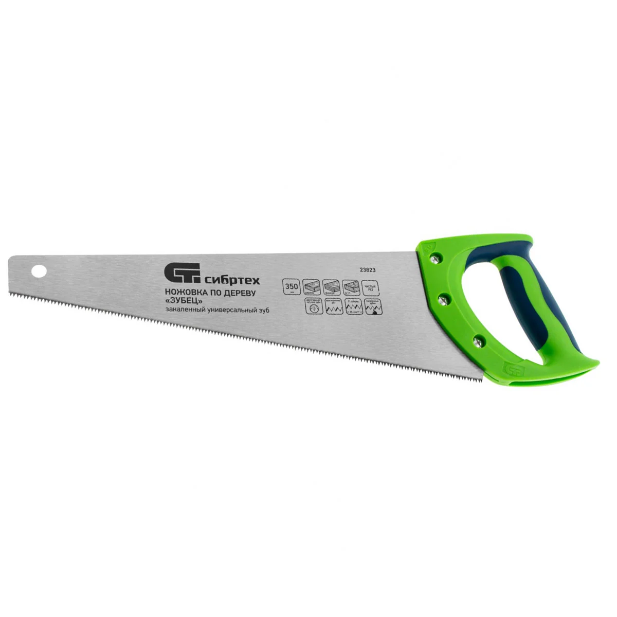 Ножовка по дереву Сибртех «Зубец» 23823 с полотном длиной 350 мм, калеными зубьями с 2D-заточкой и шагом 11 TPI, 2-компонентной рукояткой, используется для распиливания заготовок из древесины, фанеры и ДСП. Рабочая часть, содержащая 11 зубьев на дюйм, обеспечивает чистый двусторонний рез. Режущую кромку можно перетачивать. Ножовка будет полезна столярам, плотникам и домашним мастерам.ПреимуществаПолотно изготовлено из пружинной стали 65Mn, поэтому выдерживает значительные нагрузки.Зубья прошли закалку, что обеспечивает инструменту высокий ресурс работоспособности.Поверхность полотна покрыта лаком, защищающим ее от коррозии.Рукоятка из ударопрочного пластика прикреплена к полотну 3 винтами, что придает конструкции надежность.Резиновые вставки на рукоятке препятствуют выскальзыванию ее из ладони, что повышает комфортность работы.