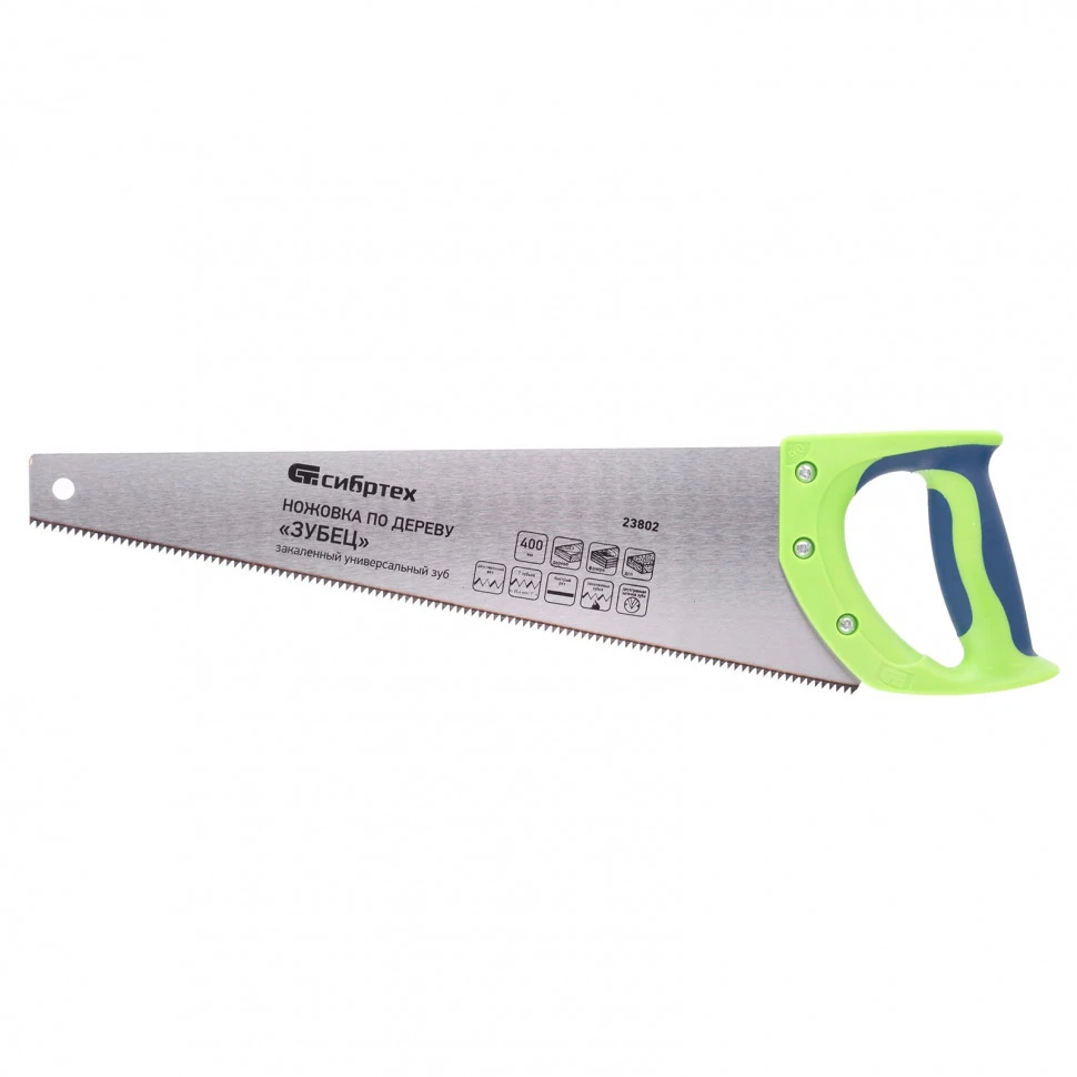 Ножовка по дереву Сибртех «Зубец» 23802 с полотном длиной 400 мм, калеными зубьями 2D-заточкой и шагом 7 TPI, с 2-компонентной рукояткой, используется для распиливания заготовок из древесины, фанеры и ДСП. Рабочая часть, содержащая 7 зубьев на дюйм, обеспечивает быстрый двусторонний рез. Режущую кромку можно перетачивать. Ножовка будет полезна столярам, плотникам и домашним мастерам.ПреимуществаПолотно изготовлено из пружинной стали 65Mn, поэтому выдерживает значительные нагрузки.Зубья прошли закалку, что обеспечивает инструменту высокий ресурс работоспособности.Поверхность полотна покрыта лаком, защищающим ее от коррозии.Рукоятка из ударопрочного пластика прикреплена к полотну 3 винтами, что придает конструкции надежность.Резиновые вставки на рукоятке препятствуют выскальзыванию ее из ладони, что повышает комфортность работы.