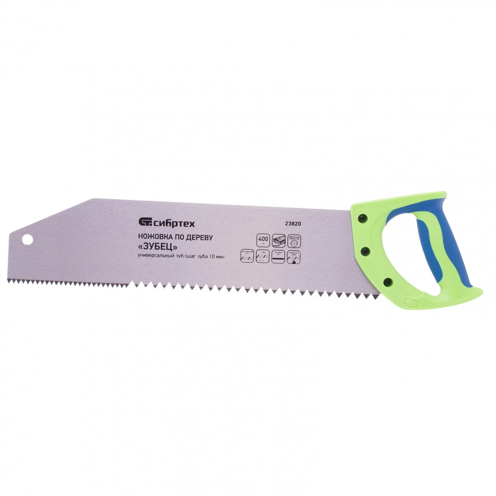 Ножовка по дереву Сибртех «Зубец» 23820 с полотном длиной 400 м, калеными зубьями с шагом 10 мм и 2D-заточкой, 2-компонентной рукояткой, используется для продольного и поперечного пиления древесины и ДСП. Рабочая кромка с шагом зубьев 10 мм обеспечивает быстрый рез. Зубья имеют 2D-заточку, благодаря чему ножовкой можно пилить в направлении как от себя, так и на себя. Возможна заточка режущей части. Ножовка применяется для выполнения плотницких работ, пригодится также и в быту.ПреимуществаПолотно изготовлено из легированной стали 65Mn, чем обусловлена его прочность и устойчивость к деформациям.Зубья ножовки закалены, что обеспечивает ей высокий ресурс работоспособности.Поверхность полотна покрыта лаком для защиты от коррозии.Рукоятка закреплена на полотне 3 винтами, поэтому не соскочит во время работы.Материал двухкомпонентной рукоятки — ударопрочный ABS-пластик, обеспечивающий надежность инструмента.Эргономичная рукоятка удобно лежит в руке, что повышает комфортность работы.
