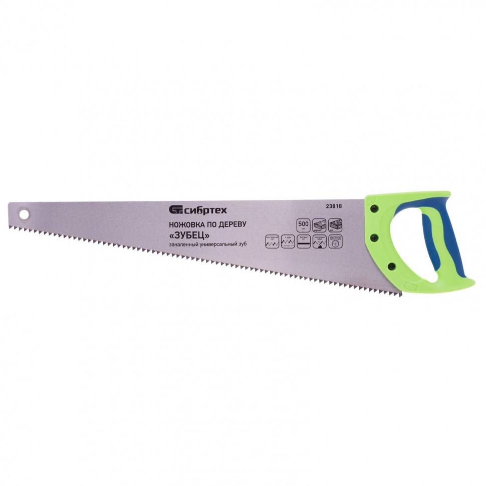 Ножовка по дереву Сибртех «Зубец» 23818 с полотном длиной 500 м, калеными зубьями с шагом 6,5 мм и 2D-заточкой, 2-компонентной рукояткой, используется для продольного и поперечного пиления древесины и ДСП. Рабочая кромка с 4 зубьями на дюйм обеспечивает быстрый рез. Зубья имеют 2D-заточку, благодаря чему ножовкой можно пилить в направлении как от себя, так и на себя. Возможна заточка режущей части. Ножовка применяется для выполнения плотницких работ, пригодится также и в быту.ПреимуществаПолотно изготовлено из легированной стали 65Mn, чем обусловлена его прочность и устойчивость к деформациям.Зубья ножовки закалены, что обеспечивает ей высокий ресурс работоспособности.Поверхность полотна покрыта лаком для защиты от коррозии.Рукоятка закреплена на полотне 3 винтами, поэтому не соскочит во время работы.Материал двухкомпонентной рукоятки — ударопрочный ABS-пластик, обеспечивающий надежность инструмента.Эргономичная рукоятка удобно лежит в руке, что повышает комфортность работы.