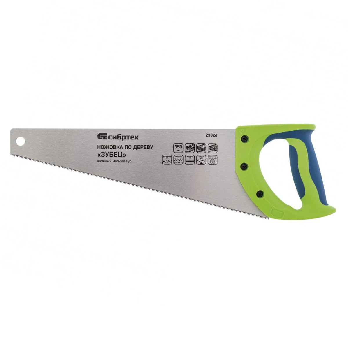 Ножовка по дереву Сибртех «Зубец» 23826 с полотном длиной 350 мм, калеными зубьями с 2D-заточкой и шагом 14 TPI, двухкомпонентной рукояткой, предназначена для точных пильных работ по древесине, фанере и ДСП. Подходит для двустороннего реза. Режущая часть с мелкими зубьями в количестве 14 на дюйм выполняет аккуратный и чистый распил. При необходимости кромку ножовки можно заточить. Инструмент будет полезен в столярной мастерской, а также пригодится в быту.ПреимуществаПрочность и долговечность — полотно изготовлено из пружинной стали 65Mn, обладающей упругостью и износостойкостью.Высокий ресурс работоспособности — зубья прошли закалку.Защита от коррозии — на полотно нанесено лаковое покрытие.Надежность — рукоятка изготовлена из ударопрочного пластика и зафиксирована на полотне при помощи 3 винтов.Комфорт во время работы — рукоятка обрезинена, поэтому не скользит в ладони и снижает нагрузку на кисть руки во время длительного пиления.