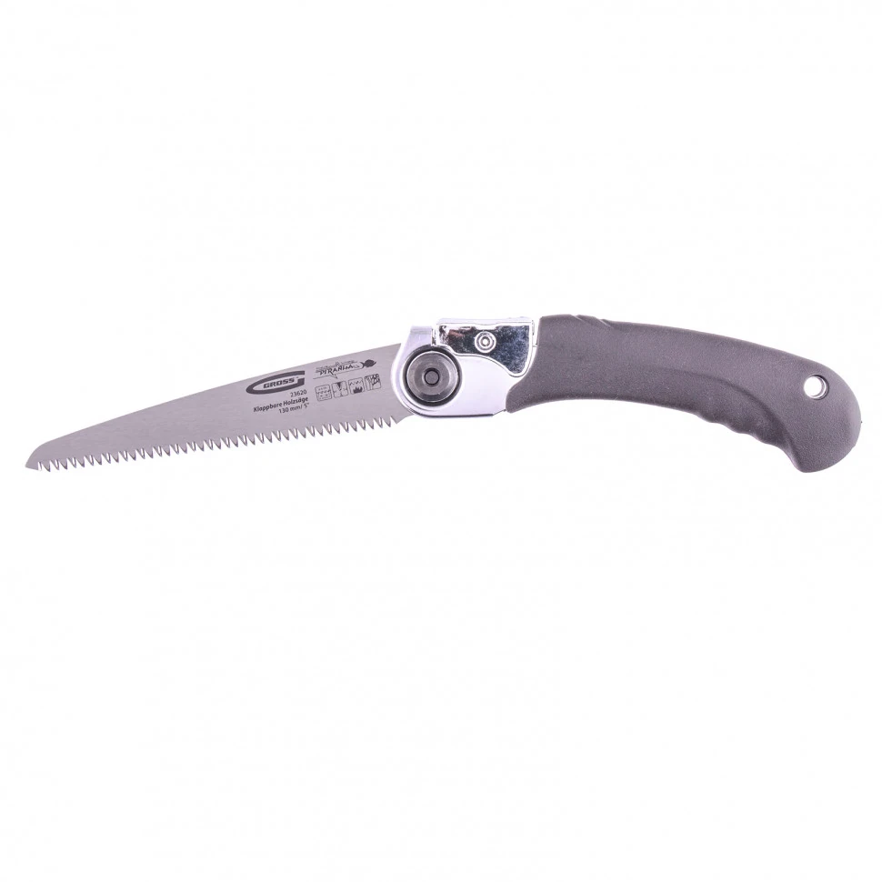Складная пила по дереву Gross PIRANHA 23620 с полотном длиной 130 мм, калеными зубьями с 3D-заточкой и шагом 8-9 TPI, с обрезиненной рукояткой, в кобуре, предназначена для кемпинга и работы в саду. Подходит для продольного и поперечного пиления древесины. Зубья с трехгранной заточкой и шагом 8-9 TPI обеспечивают быструю распиловку. Пила легко складывается, поэтому ее можно брать с собой в поездку, поход или на пикник, не опасаясь пораниться в процессе транспортировки. В комплект входит чехол-кобура, которую можно повесить на ремень.ПреимуществаПолотно изготовлено из высококачественной японской стали SK-5 твердостью 52 HRC, поэтому характеризуется прочностью и износостойкостью.Зубья закалены на 2/3 высоты до твердости 64-66 HRC, поэтому пила успешно справляется с распиловкой древесины твердых пород.Основания зубьев не проходили дополнительную закалку, что уменьшает риск слома зубьев во время работы с твердыми материалами или при случайном попадании на посторонний предмет.Эргономичная обрезиненная рукоятка не с