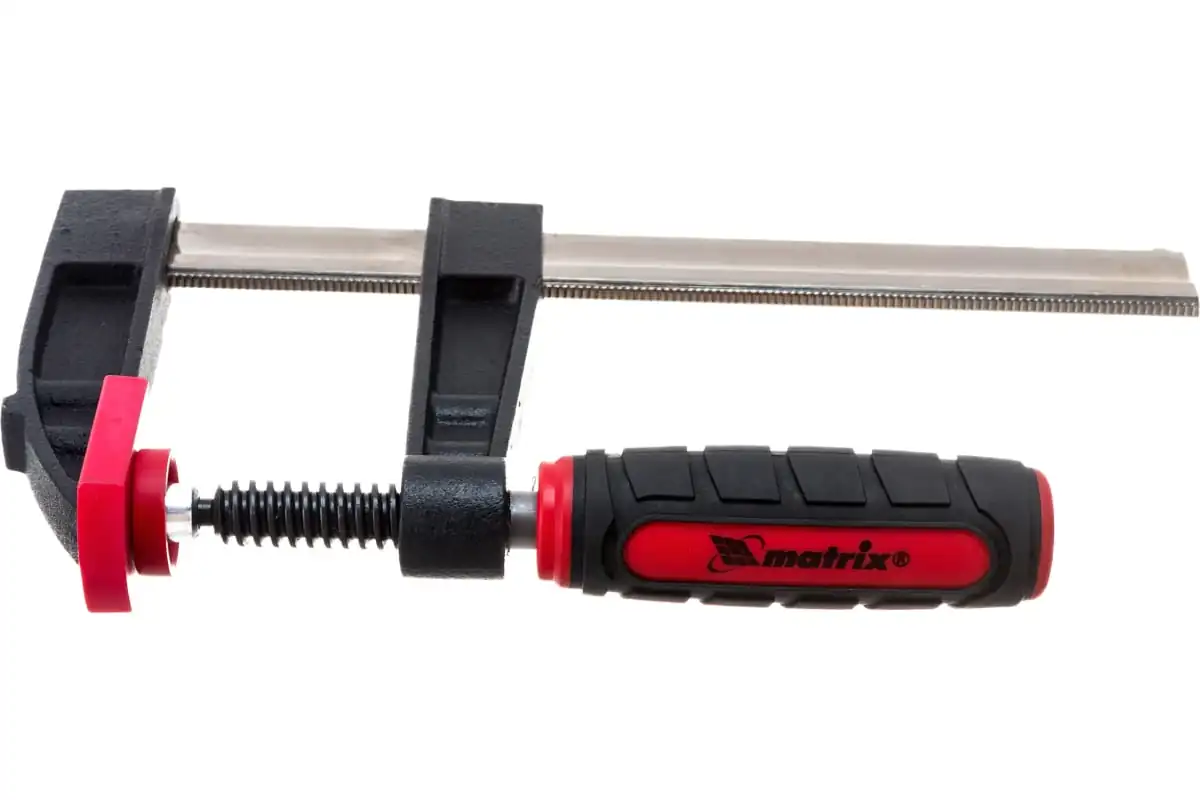 F-образная струбцина Matrix 20400, 150 х 80 х 230 мм, используется для зажима металлических, деревянных и других заготовок для их последующей обработки или сборки. Представляет собой штангу, на которой установлены 2 кронштейна — неподвижный и подвижный. Деталь помещается между ними и прижимается к губкам при помощи винтового зажима с трапециевидной резьбой. Величина захвата может достигать 150 мм, она регулируется при помощи подвижного кронштейна. Струбцину применяют при выполнении слесарных и столярных работ. Металлическая конструкция выдерживает высокую температуру, поэтому инструмент пригодится во время сварки, при этом необходимо будет снять пластиковые накладки с губок.ПреимуществаПрочная стальная штанга выдерживает повышенные нагрузки и позволяет фиксировать заготовки со значительным усилием.На губках установлены пластиковые накладки, которые предохраняют поверхность детали от повреждения при сильном сжатии.Эргономичная двухкомпонентная обрезиненная рукоятка имеет рельефный дизайн и не выскальзывает из