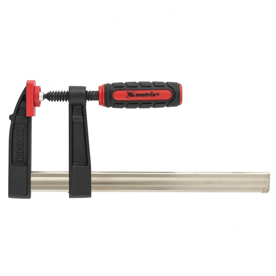 F-образная струбцина Matrix 20401, 200 х 80 х 280 мм, используется для зажима металлических, деревянных и других заготовок для их последующей обработки или сборки. Представляет собой штангу, на которой установлены 2 кронштейна — неподвижный и подвижный. Деталь помещается между ними и прижимается к губкам при помощи винтового зажима с трапециевидной резьбой. Величина захвата может достигать 200 мм, она регулируется при помощи подвижного кронштейна. Струбцину применяют при выполнении слесарных и столярных работ. Металлическая конструкция выдерживает высокую температуру, поэтому инструмент пригодится во время сварки, при этом необходимо будет снять пластиковые накладки с губок.ПреимуществаПрочная стальная штанга выдерживает повышенные нагрузки и позволяет фиксировать заготовки со значительным усилием.На губках установлены пластиковые накладки, которые предохраняют поверхность детали от повреждения при сильном сжатии.Эргономичная двухкомпонентная обрезиненная рукоятка имеет рельефный дизайн и не выскальзывает из