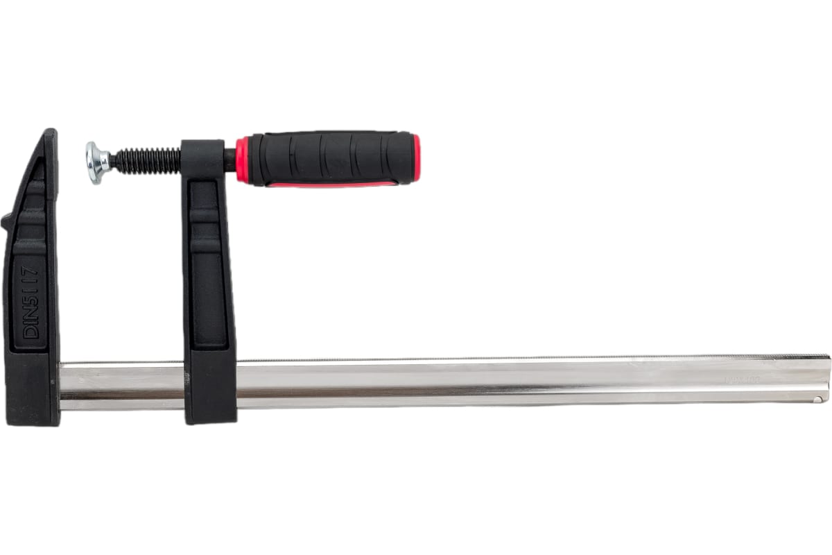F-образная струбцина Matrix 20411, 400 х 120 х 500 мм, используется для зажима металлических, деревянных и других заготовок для их последующей обработки или сборки. Представляет собой штангу, на которой установлены 2 кронштейна — неподвижный и подвижный. Деталь помещается между ними и прижимается к губкам при помощи винтового зажима с трапециевидной резьбой. Величина захвата может достигать 400 мм, она регулируется при помощи подвижного кронштейна. Струбцину применяют при выполнении слесарных и столярных работ. Металлическая конструкция выдерживает высокую температуру, поэтому инструмент пригодится во время сварки, при этом необходимо будет снять пластиковые накладки с губок.ПреимуществаПрочная стальная штанга выдерживает повышенные нагрузки и позволяет фиксировать заготовки со значительным усилием.На губках установлены пластиковые накладки, которые предохраняют поверхность детали от повреждения при сильном сжатии.Эргономичная двухкомпонентная обрезиненная рукоятка имеет рельефный дизайн и не выскальзывает из