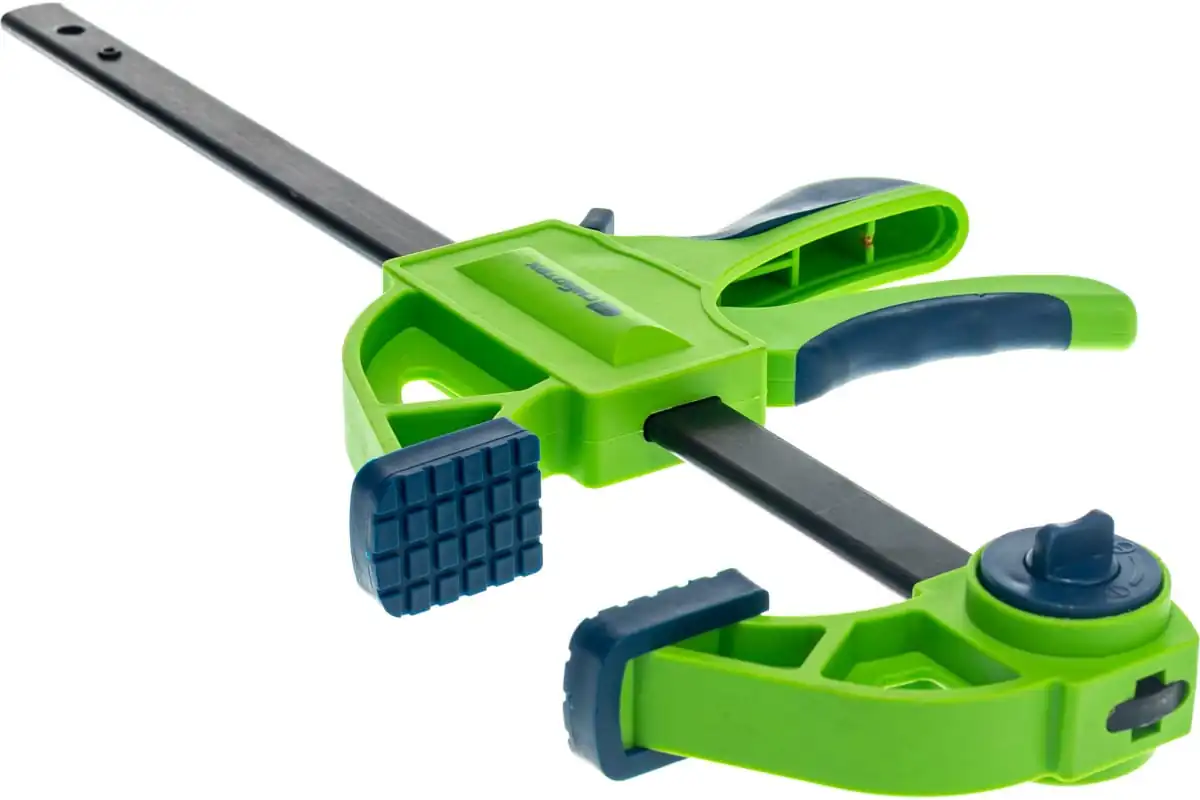 F-образная быстрозажимная струбцина Сибртех 20564, 200 х 70 х 420 мм, в пластиковом корпусе, с фиксатором и двухкомпонентной рукояткой, позволяет зажимать заготовки для их дальнейшей обработки или сборки. Помогает решать множество задач благодаря оптимальной глубине зажима, составляющей 70 мм. Пластинчатый механизм пошагово перемещает подвижную губку вдоль направляющей до достижения максимально плотного захвата детали. Фиксатор препятствует движению губки в обратную сторону. Струбцина пригодится в столярной мастерской, а также будет полезна в быту.ПреимуществаШтанга изготовлена из стали, а корпус — из ударопрочного ABS-пластика, что увеличивает надежность конструкции.На губках имеются накладки, защищающие поверхность зажимаемого предмета от повреждений.Опорную губку можно переставить на другой конец штанги, превратив струбцину в распорный инструмент.Эргономичные двухкомпонентные рукоятки удобно лежат в руке, что обеспечивает комфортность работы.