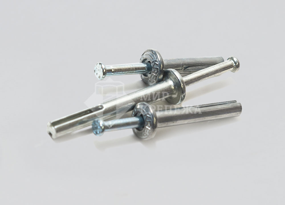 Дюбель-гвоздь металлическии забиваемый состоит из стального дюбеля (изготавливается из сплава алюминия с цинком) с ограничительным бортиком и распорного гвоздя (изготавливается из стали) которым осуществляется крепление. Дюбель-гвоздь металическии забиваемый используют для несьемного крепления профилей различных тонколистовых материалов к бетону, камню и кирпичу.