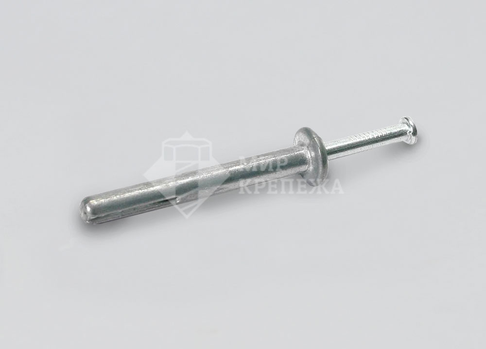 Дюбель-гвоздь металлическии забиваемый состоит из стального дюбеля (изготавливается из сплава алюминия с цинком) с ограничительным бортиком и распорного гвоздя (изготавливается из стали) которым осуществляется крепление. Дюбель-гвоздь металическии забиваемый используют для несьемного крепления профилей различных тонколистовых материалов к бетону, камню и кирпичу.