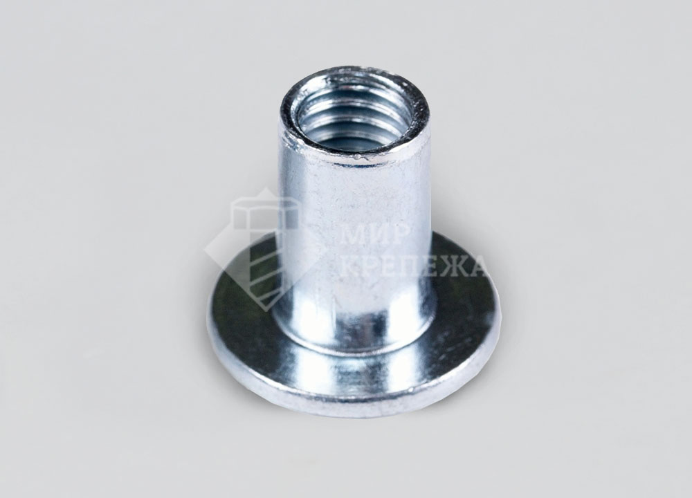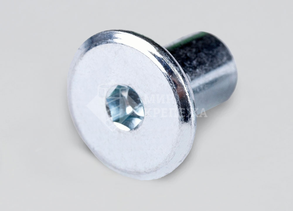 Представляет собой цилиндр с внутренней резьбой с плоской шляпкой, с шлицем типа "внутренний шестигранник". Применяется в мебельном производстве для скрепления различных деталей в сочетании с винтом, подходящим по размеру как правило с такой же шляпкой как и у гайки. Бывает так же разновидность гайки с полукруглой головкой и внутренним шестигранником.