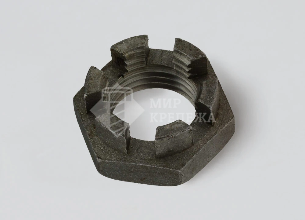 Гайка DIN 937 низкая корончатая без покрытия сочетает низкий профиль с корончатой формой, обеспечивая защиту резьбы и предотвращая самопроизвольное ослабление. Применяется с болтами, шпильками, валами, в которых присутствуют отверстия для шплинтования.