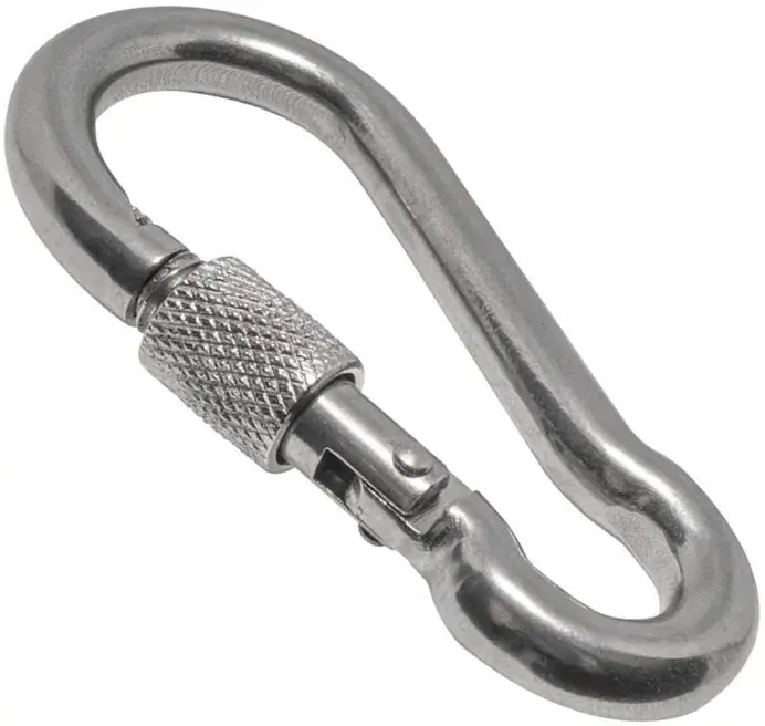 Карабин DIN 5299D - карабин с муфтой имеет форму овала, чуть зауженного с одной стороны. Карабин оснащен фиксатором, который для надежности закручивается на резьбу. Карабин DIN 5299D пожарный с фиксатором это высокопрочный соединитель для тросов. Карабин используют монтажники-высотники, пожарные, альпинисты, спасатели и многие другие профессионалы и любители. Производят из нержавеющей стали.