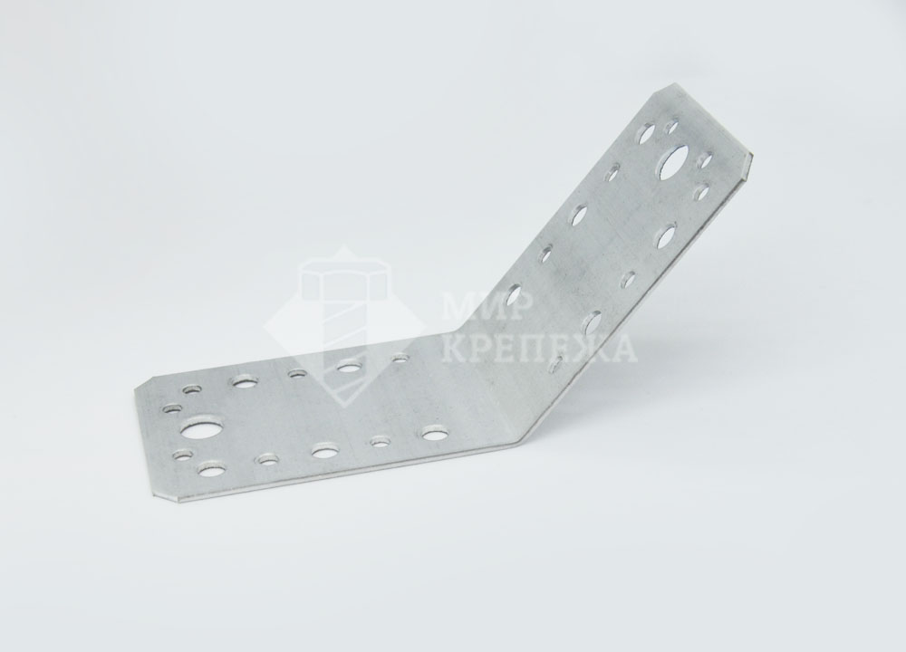 Крепежный уголок 135 градусов KUS - изготавливается уголок из стали холодной накатки, визуально представляет пластину загнутую под углом в 135 градусов с различными отверстиями для крепежа. Уголок KUS применяется в тех случаях, когда крепление необходимо проводить не под стандартным углом в 90 градусов, а в тех случаях, когда угол ровняется 135 градусам. Чаще всего используется для крепления стропил из дерева к основанию из кирпича или бетона.