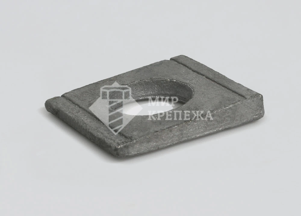 Шайба DIN 434 без покрытия косая клиновая с двойной проточкой имеет квадратную форму с углами, обеспечивающими надежное распределение нагрузки, особенно под угловыми соединениями. Отсутствие покрытия делает ее подходящей для стандартных условий эксплуатации без специфических требований к коррозионной устойчивости.