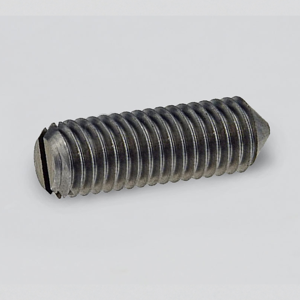 Винт DIN 553 установочный без покрытия представляет собой металлический стержень с резьбой по всей длине без головки, на одном конце находится шлиц (разъем для отвертки или биты), а на другом окончание конусной формы. Окончание используется для улучшения фиксации скрепляемых деталей. Метиз идеально подходит для крепежа в узких местах, где требуется высокая точность. Винт обеспечивает надежное соединение, идеален для мелких механических работ.