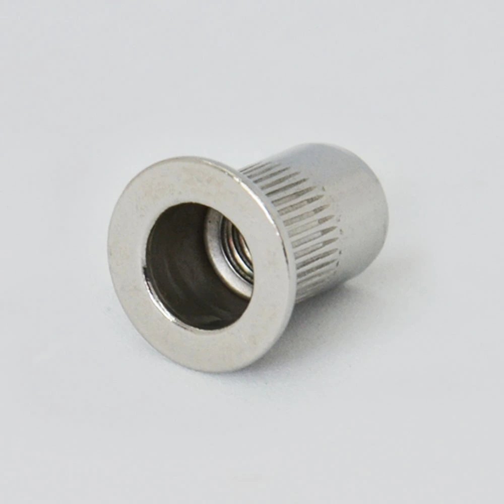 Гайка заклепка стандартный борт - заклепка резьбовая цилиндрическая с насечкой (рифленые) со стандартным буртиком из стали применяется в основном при необходимости выполнения прочной резьбы в листовом металле, когда нарезание резьбы невозможно. Резьбовые заклепки имеют внутреннюю резьбу для крепления винтов. Заклепки цилиндрической формы применяются для установки в круглое отверстие. Насечка наносится с целью предотвратить прокручивание крепежного узла. Обычно используется в машиностроении и при производстве двигателей, где изделие подвергается интенсивным вибрационным и динамическим нагрузкам.