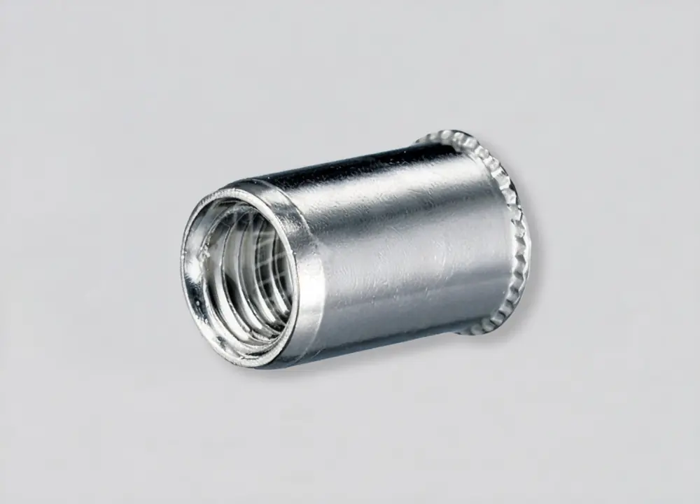 Гайка заклепка уменьшенный борт - цилиндрическая заклепка с уменьшенным бортиком позволяет прочно соединять тонкие листовые заготовки из металлов и пластика. При этом создается монтажное гнездо для установки винта с метрической резьбой. Уменьшенный бортик головки позволяет проводить монтаж в потай, выступающих частей на поверхности заготовки не остается. В отличие от потайного бортика уменьшенный не требует дополнительной зенковки отверстия. Таким образом, применение заклепки с уменьшенным бортиком уменьшает технологичность монтажа и сокращает время установки. Насечка на корпусе заклепки исключает проворот, обеспечивая прочное виброустойчивое соединение.