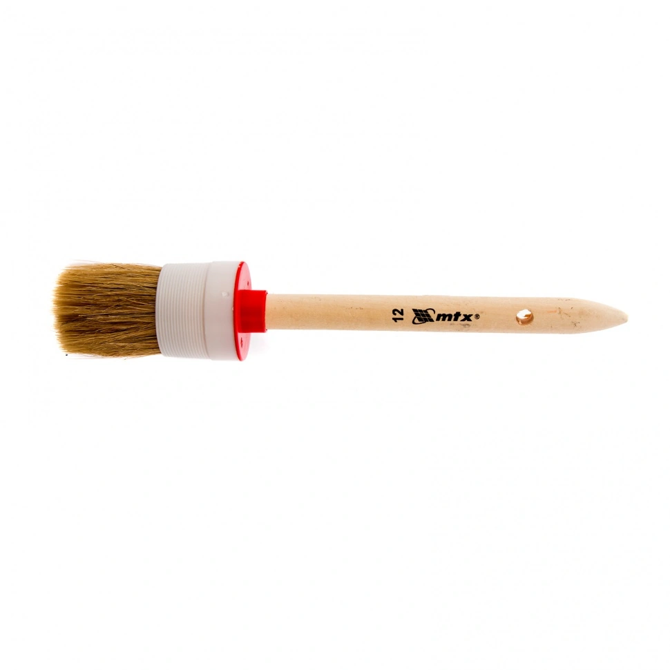 Круглая кисть MTX №12 (45 мм) 82082 с натуральной щетиной и деревянной ручкой пригодится в быту для окрашивания узких длинных поверхностей. Светлая натуральная свиная щетина с добавлением искусственной обладает высокой износоустойчивостью и может использоваться для нанесения красок с содержанием растворителей, а также масляных красок и лаков.ПреимуществаЩетина двойной выварки обеспечивает высокое качество работы, т.к. не содержит включений жира и мелких частиц грязи.Расщепленная на концах щетина увеличивает способность кисти впитывать и отдавать ЛКМ, таким образом повышается эффективность работы.Пластиковый бандаж обеспечивает надежную фиксацию щетины и не подвержен коррозии.Рукоятка из отборной древесины прошла шлифовку и имеет защитное лаковое покрытие, поэтому с ней комфортно работать.На рукоятке предусмотрено отверстие для подвешивания, что обеспечивает удобство хранения.