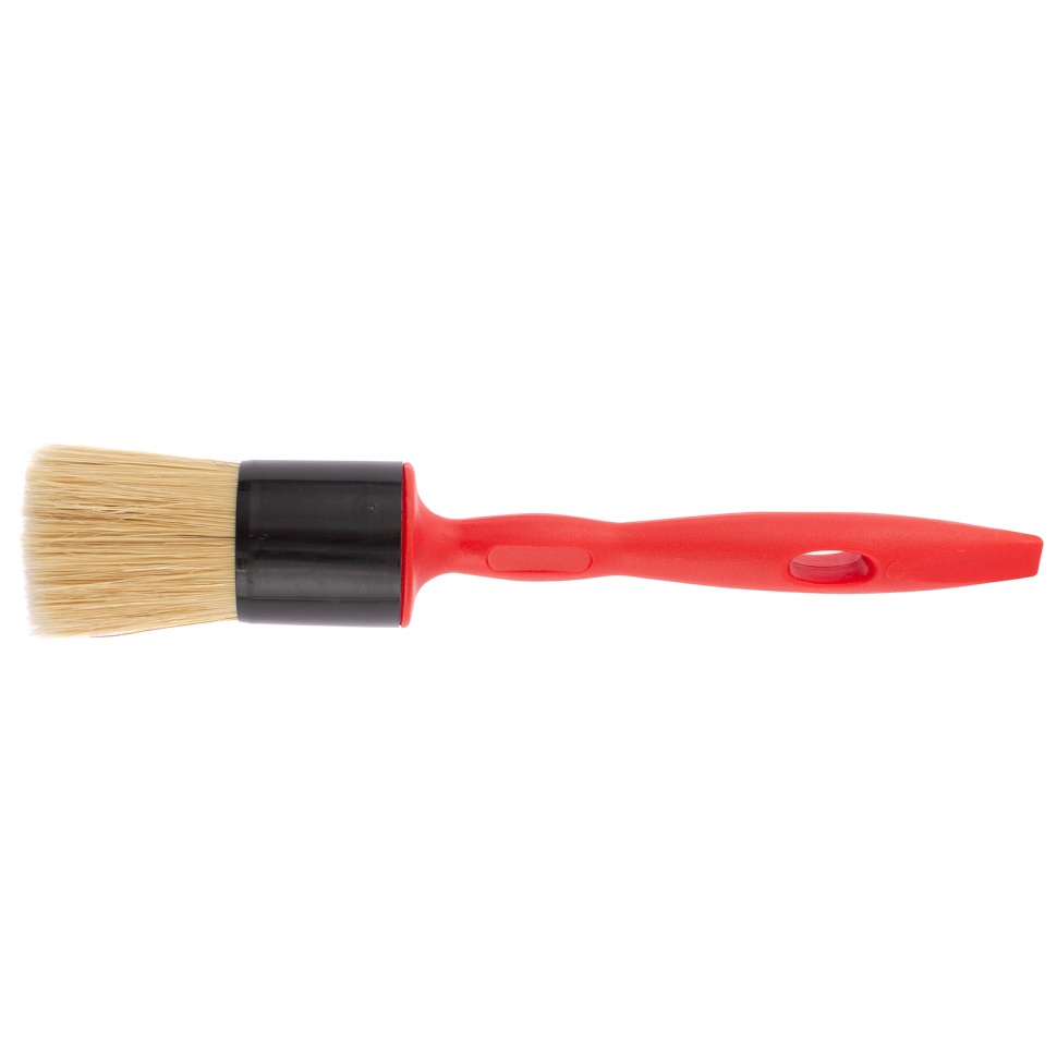Круглая кисть Matrix Color Line №40 83410 с натуральной щетиной и пластиковой ручкой применяется для окрашивания длинных узких поверхностей любыми видами лакокрасочных материалов. За счет плотной набивки пучка кисть хорошо впитывает и отдает краску. Удлиненная ручка упрощает работу в малодоступных местах.ПреимуществаНатуральная светлая щетина с небольшим добавлением искусственной сохраняет упругость и не деформируется при использовании с любыми ЛКМ.Щетина обладает эффектом «памяти» — быстро возвращает форму даже при интенсивной работе кистью.У щетинок расщеплены кончики, поэтому кисть удерживает и равномерно распределяет большой объем краски.Бандаж изготовлен из полипропилена, а значит, не подвержен разрушению при длительном контакте с ЛКМ или водой.Пластиковые клинья не допускают деформации кисти при замачивании в воде, это позволяет продлить срок ее службы.Щетина проклеена тщательно подобранным эпоксидным клеем, удерживается с помощью клиньев и бандажа, поэтому кисть обладает повышенным качеством и выдержив